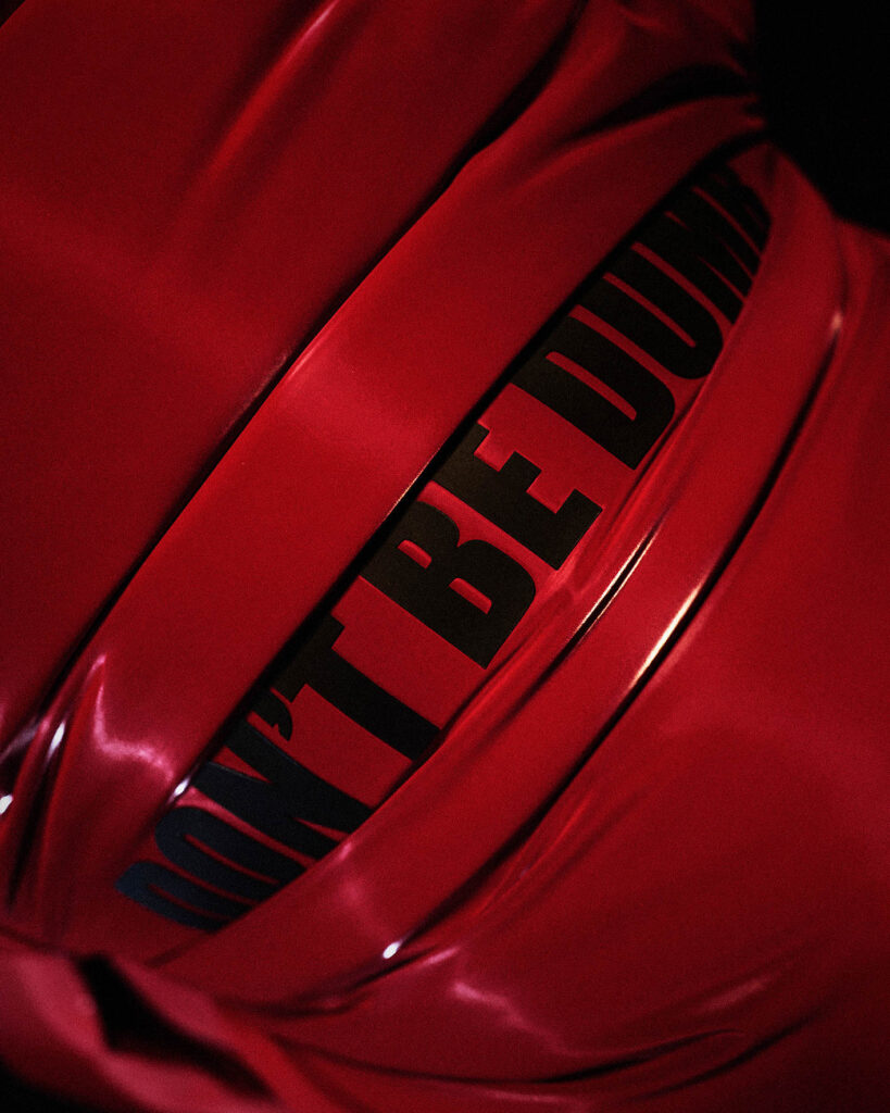 The campaign, directed by Charlotte Rutherford, unfolds in a blackout setting where the garments’ saturated tonesand reflective surfaces dominate the visual field. An accompanying audiovisual piece by Dan Streit expands on Rocky’s creative universe, tying the capsule to his broader artistic identity.