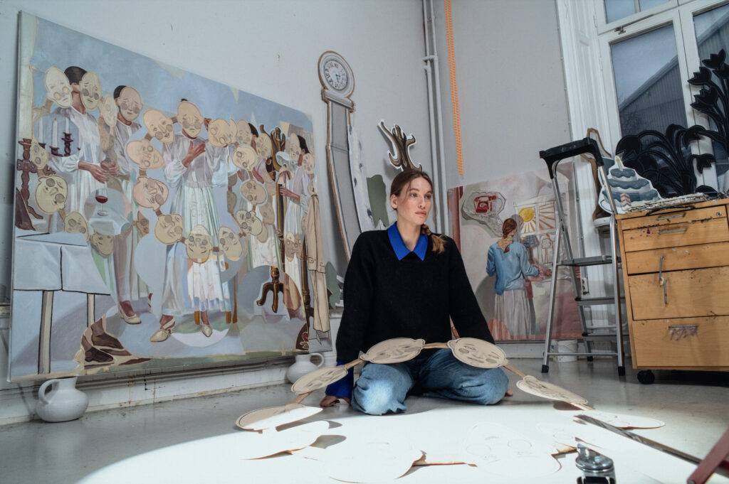 Based in Stockholm, Sweden, Alice Herbst often implements materials such as cardboard, paper and fabric to create props that give life to the atmosphere in her paintings. Like a set designer, she arranges these crafted objects and explores how the context encourages the viewer to imagine a story in motion.