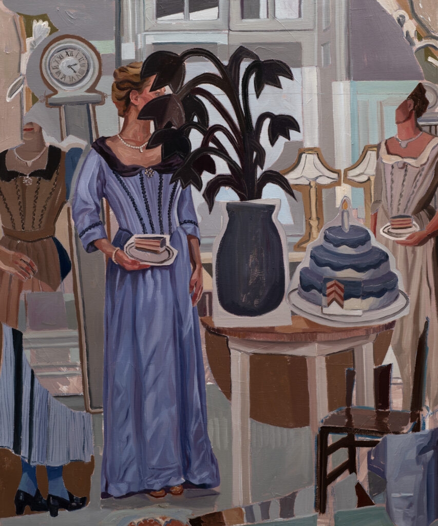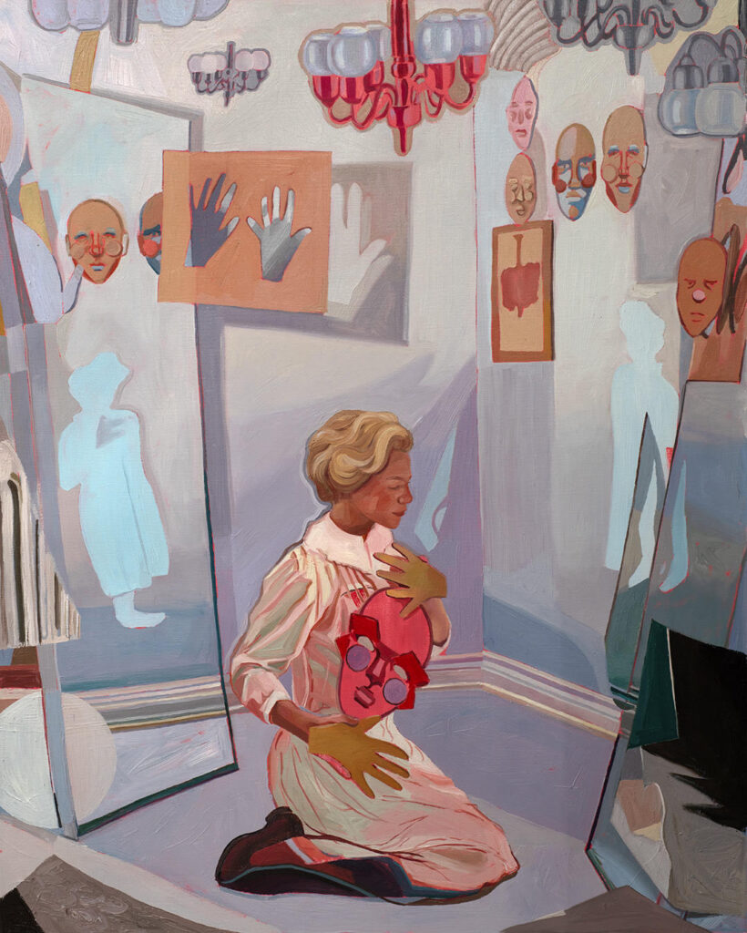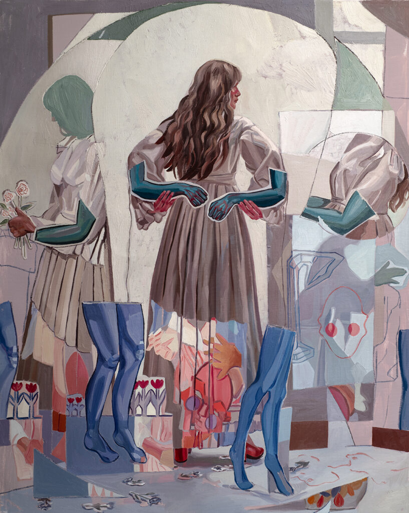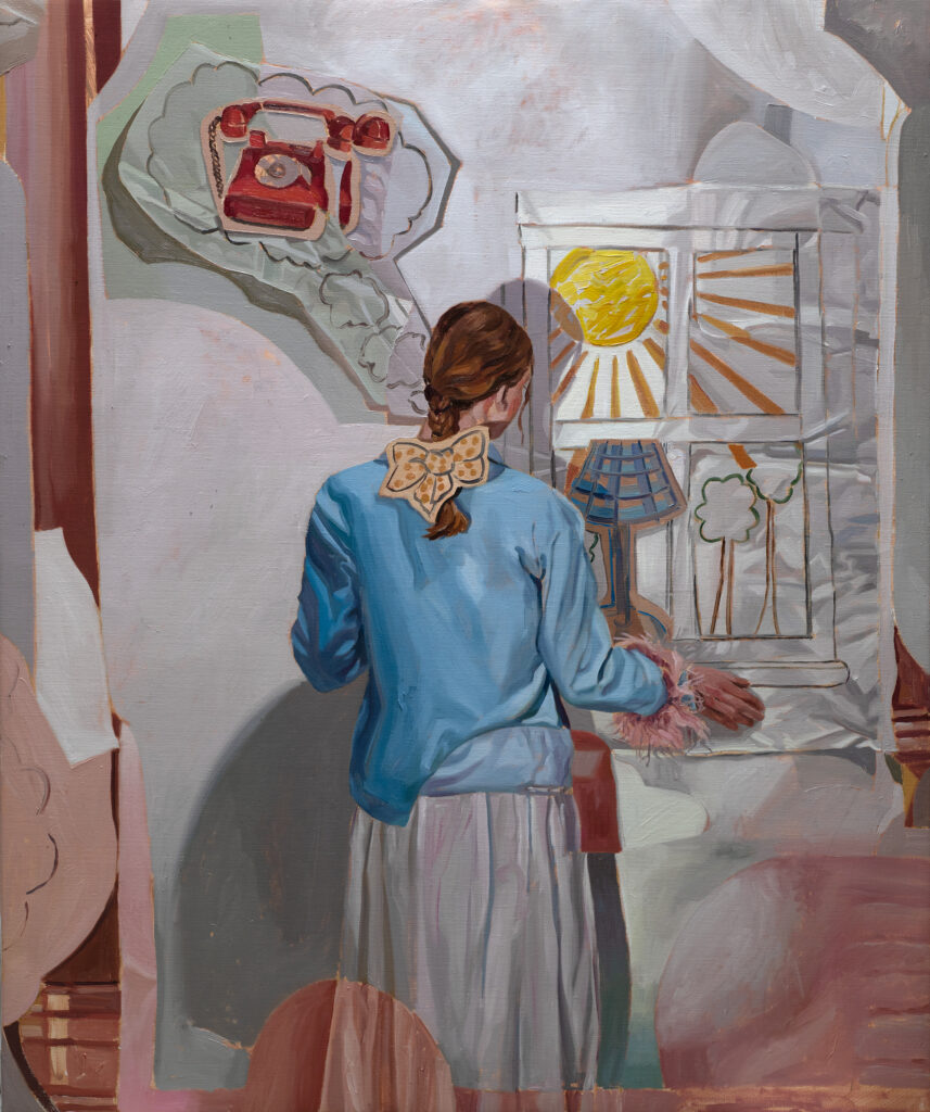 Photographs of these constructed worlds become the starting point for her oil paintings, where objects, shapes, and characters are reinterpreted in paint. This ongoing practice, called “The Whispering Game,” grew from her early experiments reusing fragments of past works alongside props and crafted objects. Like the children’s game where a whispered phrase changes as it moves from person to person, repeated motifs in her paintings transform over time, inviting viewers to trace connections and discover evolving meanings across her work.