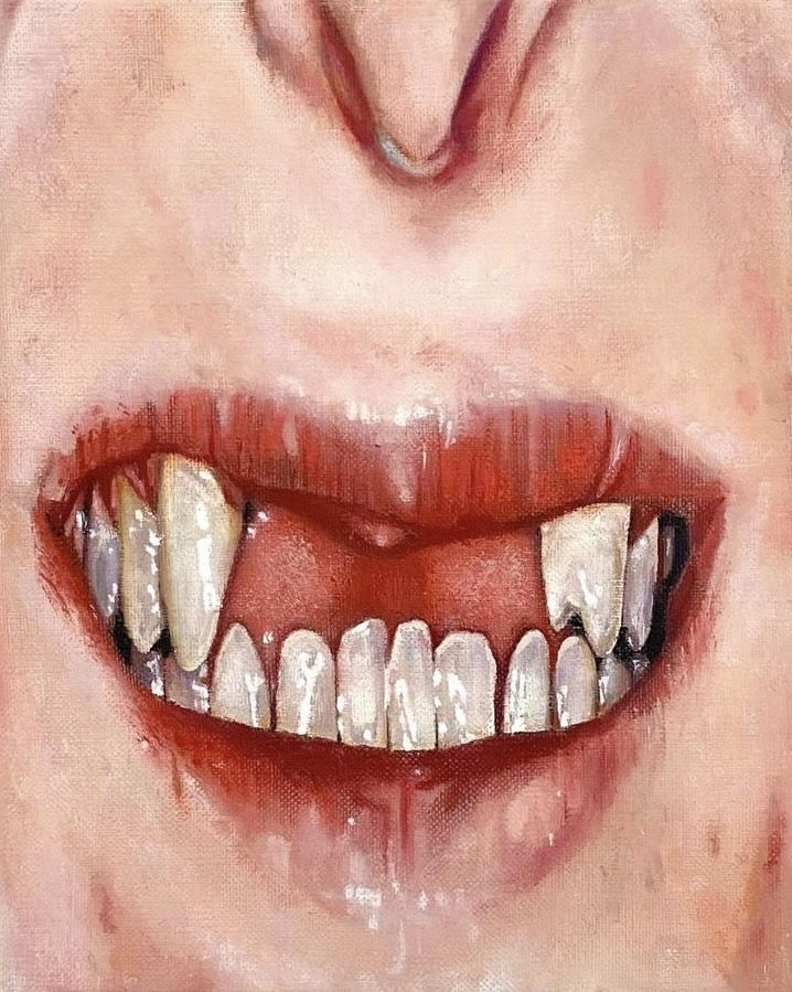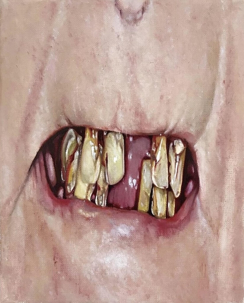 The reference images I used were primarily sourced from the ‘before’ photographs used in dental company promotions. What struck me about these images was a particular contradiction they contain: individuals revealing a feature they likely feel a profound shame over, yet being asked to present that in the form of a smile. There’s also something faintly animal in these gestures, a defensive baring of teeth, but here the teeth are pitifully damaged and incapable of threat.