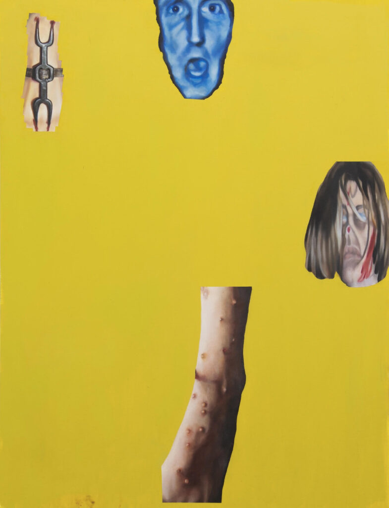 A recurring motif in his work is the depiction of abject aspects of the human body, such as blemishes, rashes, and missing teeth. Removed from conventional aesthetic or symbolic frameworks, these fragmented bodily elements underscore the strangeness of embodiment itself: the condition of consciousness tethered to a vulnerable physical form. In this context, the body is not idealised or expressive, but fragile—an unstable structure subject to degeneration, fallibility, and inevitable decay.