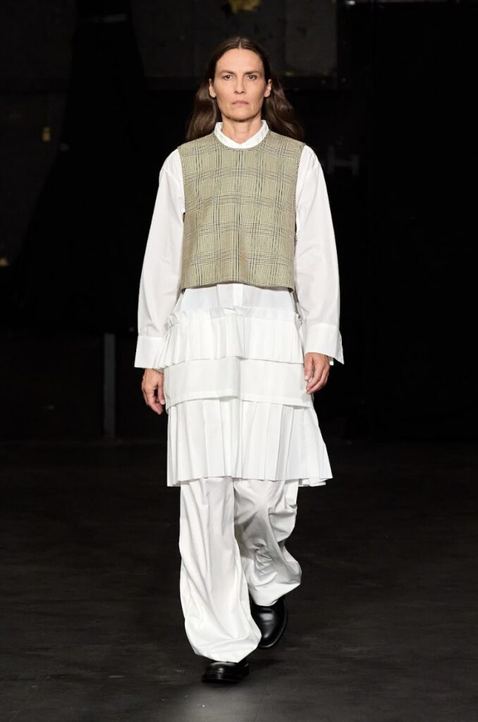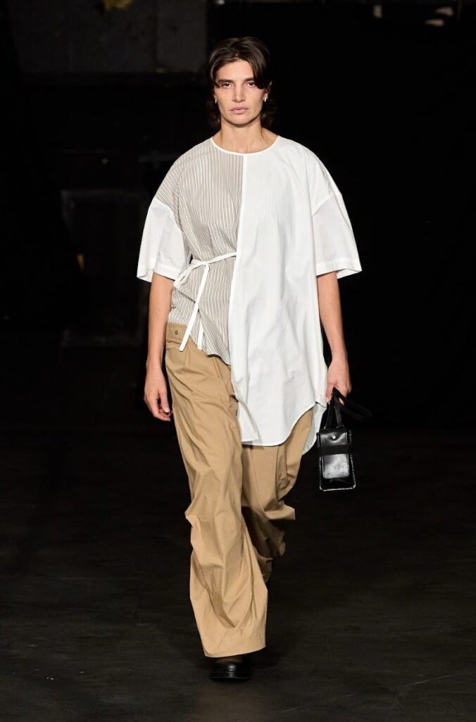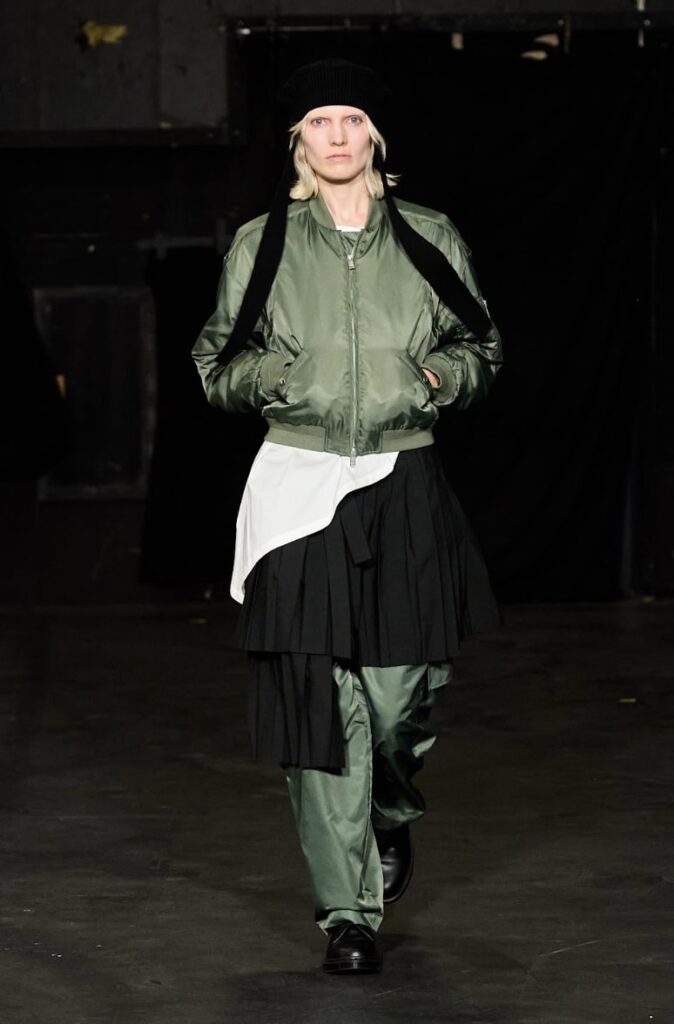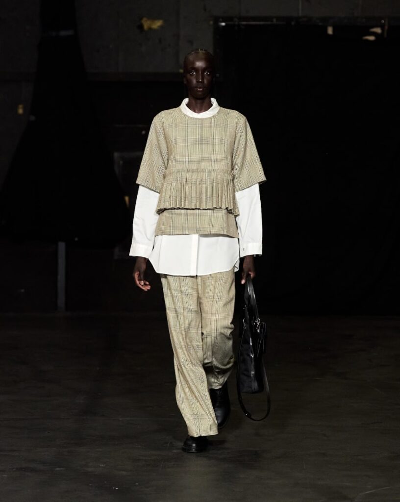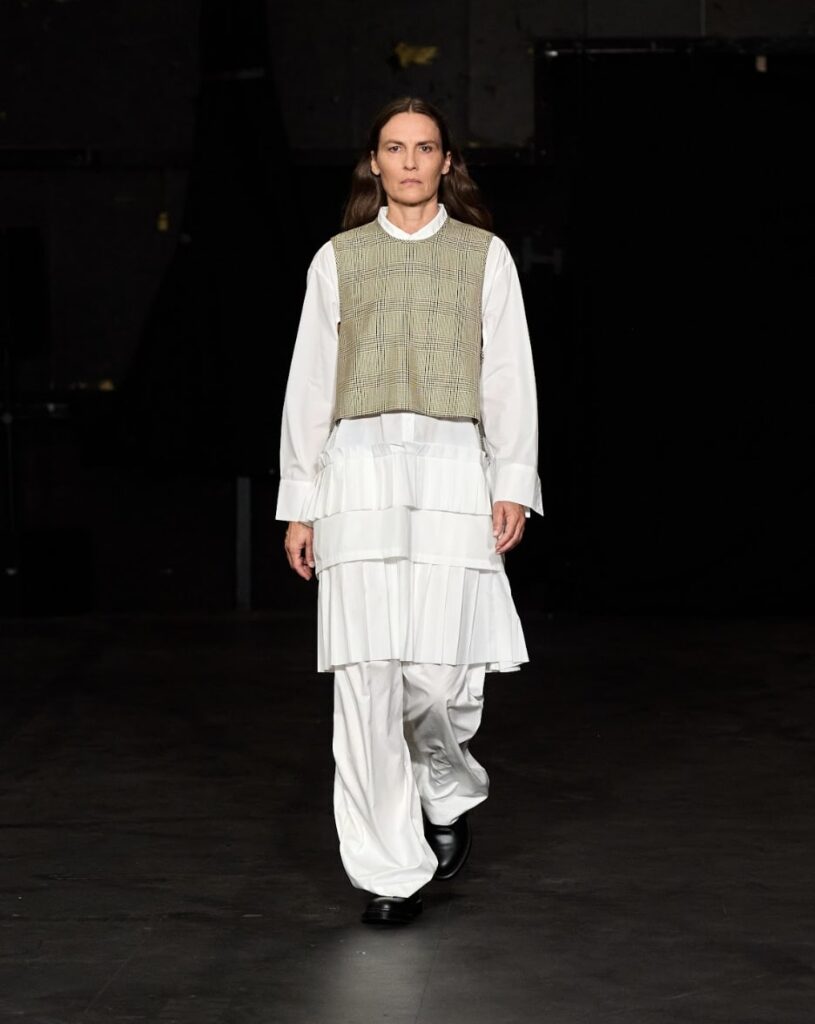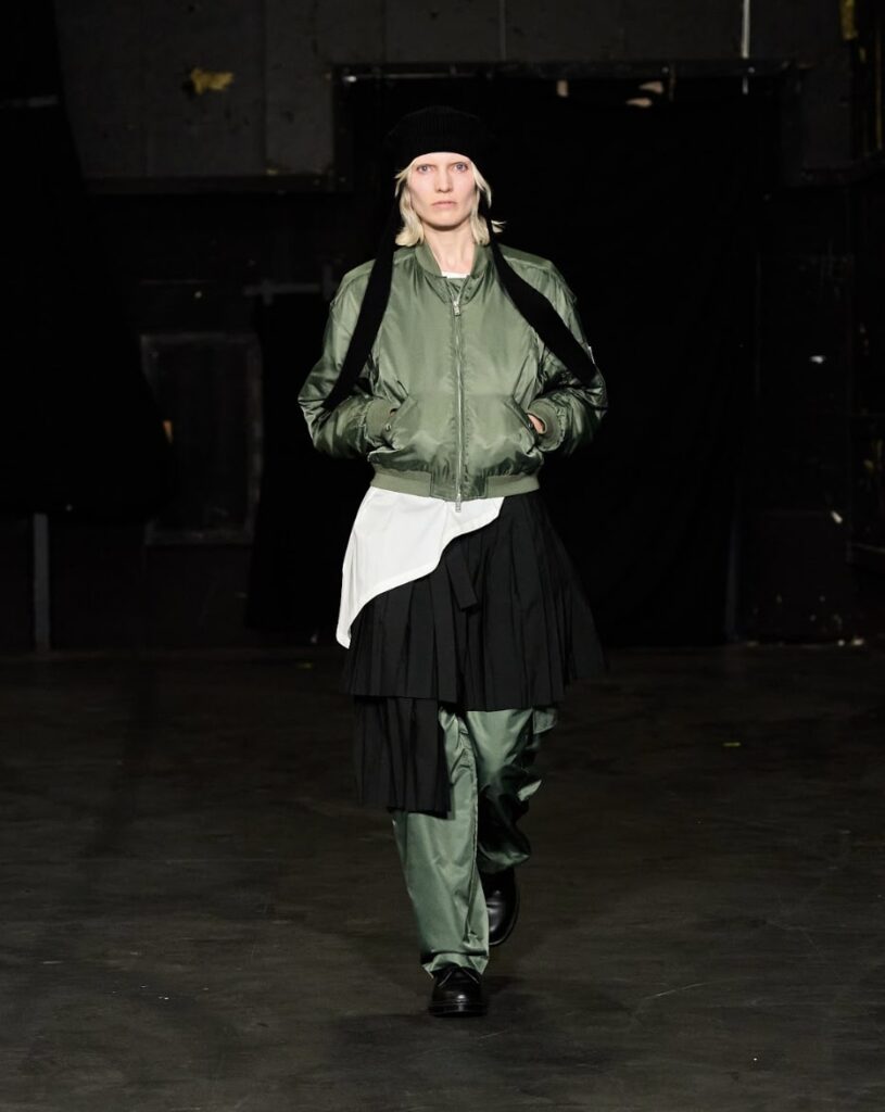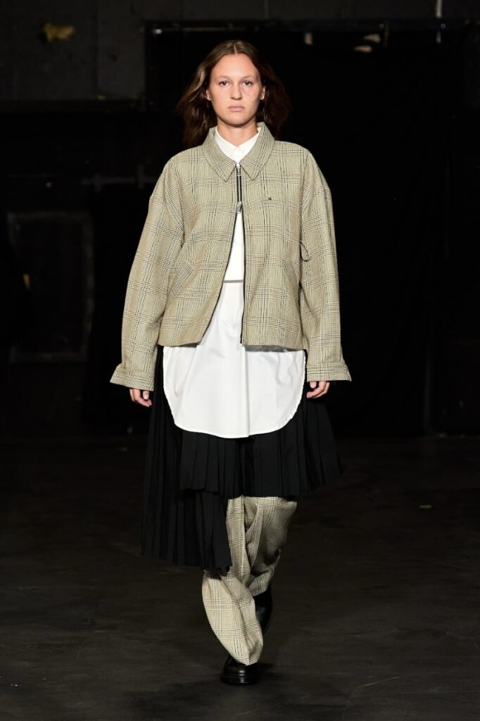 The collection delivers exactly that: a sharply constructed yet wearable uniform of contemporary essentials. A green nylon flight bomber—paired with matching trousers—offers a fresh take on utilitarian tailoring. Pleated skirts over houndstooth trousers, asymmetrical cardigans, and tied shirting encourage layered silhouettes and subtle disruption. It’s a brand built to be lived in—refined without rigidity, practical without compromise.