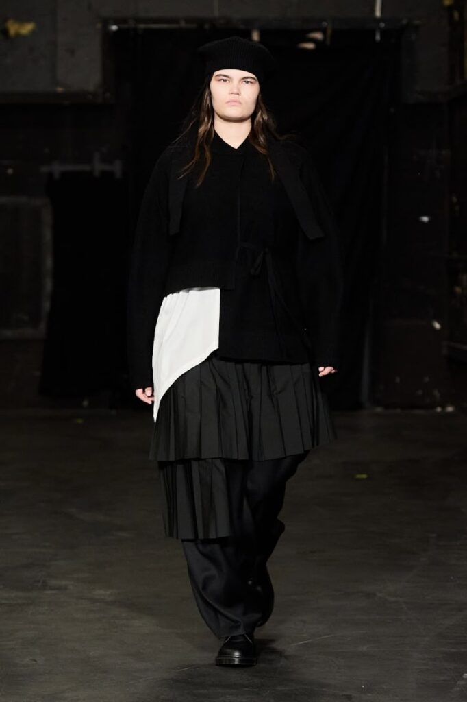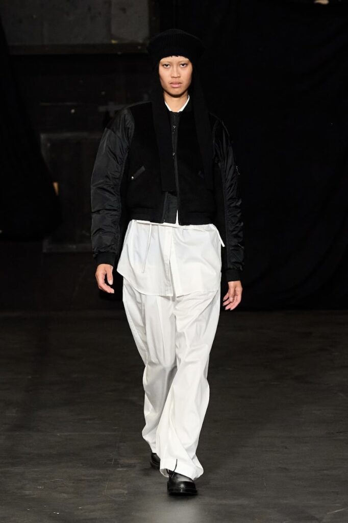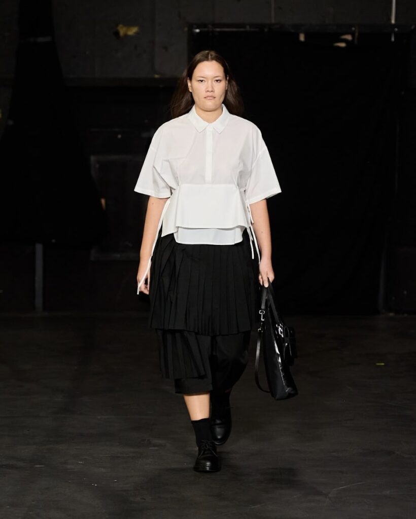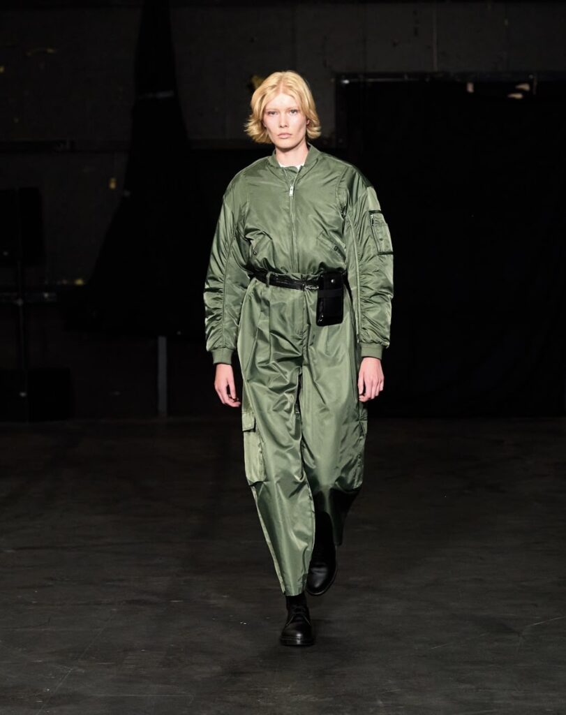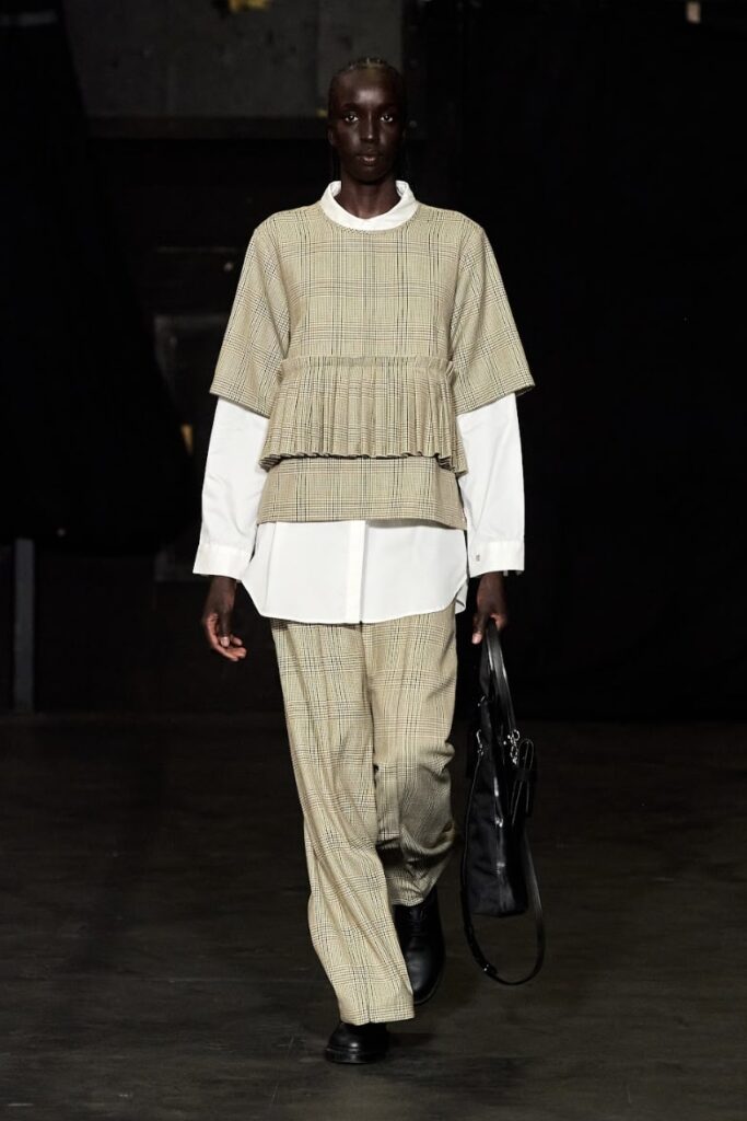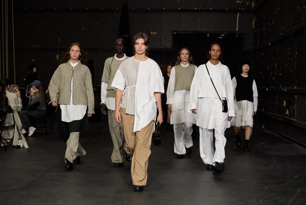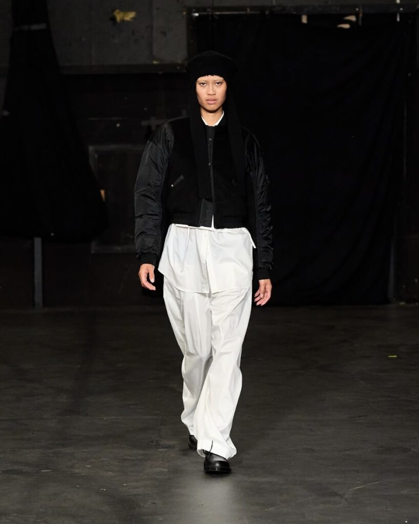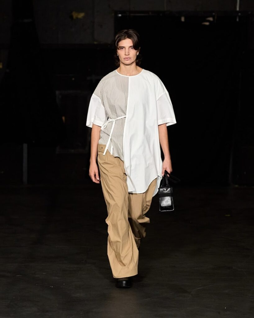 The collection delivers exactly that: a sharply constructed yet wearable uniform of contemporary essentials. A green nylon flight bomber—paired with matching trousers—offers a fresh take on utilitarian tailoring. Pleated skirts over houndstooth trousers, asymmetrical cardigans, and tied shirting encourage layered silhouettes and subtle disruption. It’s a brand built to be lived in—refined without rigidity, practical without compromise.