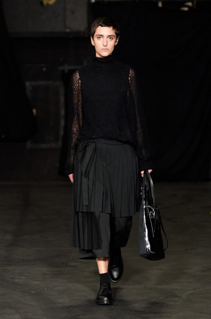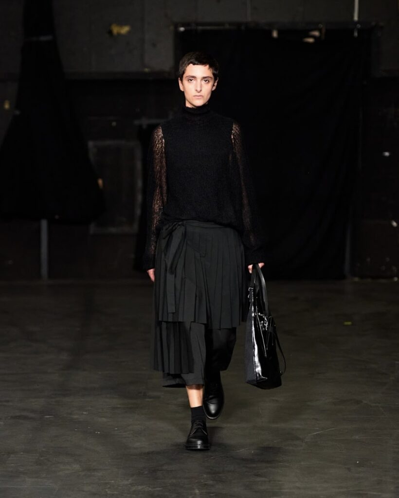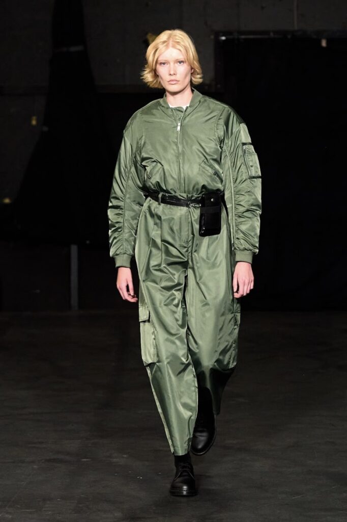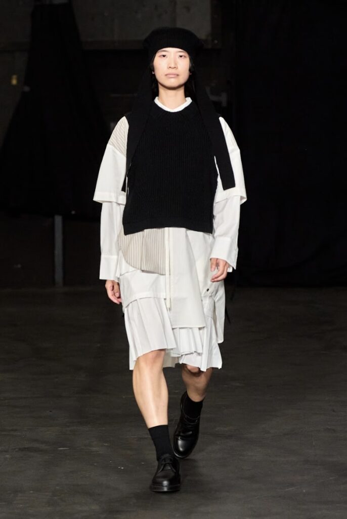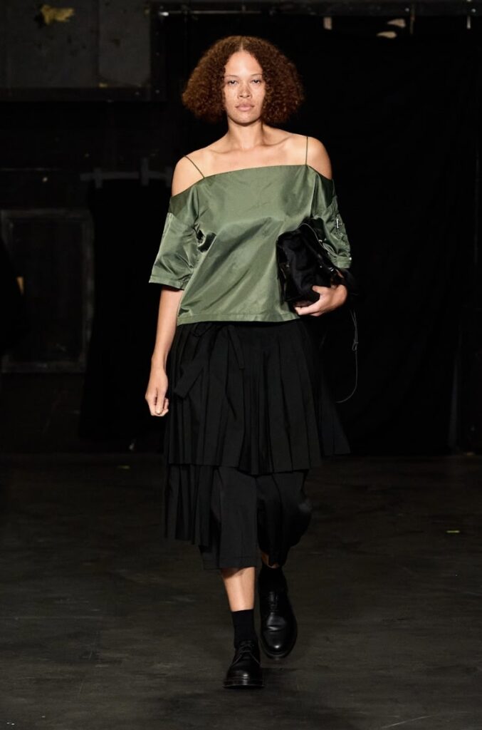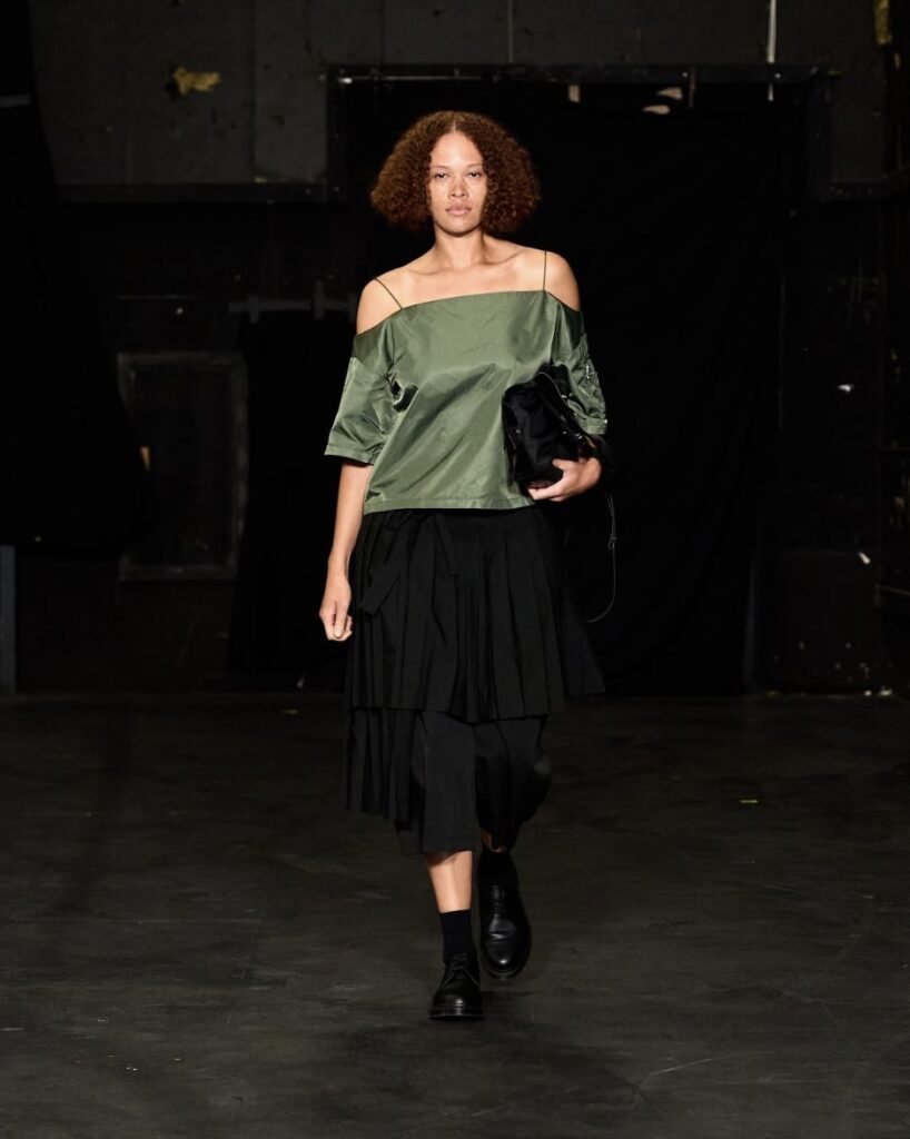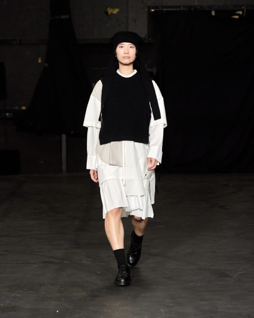 The collection delivers exactly that: a sharply constructed yet wearable uniform of contemporary essentials. A green nylon flight bomber—paired with matching trousers—offers a fresh take on utilitarian tailoring. Pleated skirts over houndstooth trousers, asymmetrical cardigans, and tied shirting encourage layered silhouettes and subtle disruption. It’s a brand built to be lived in—refined without rigidity, practical without compromise.
