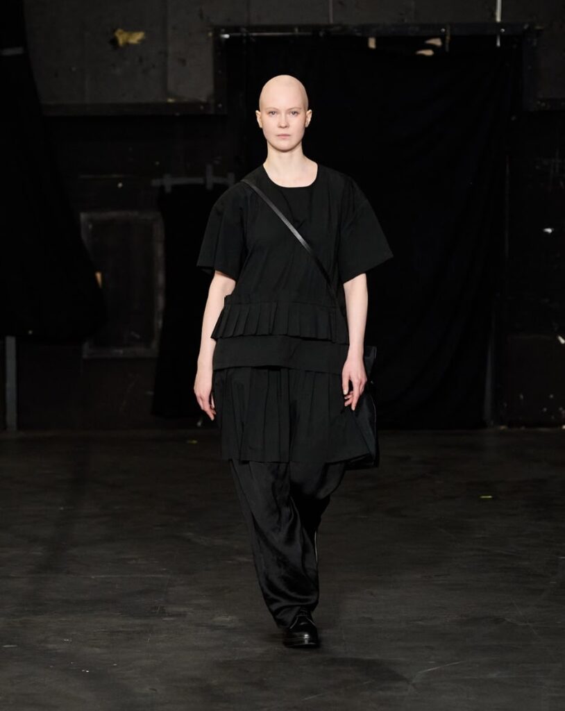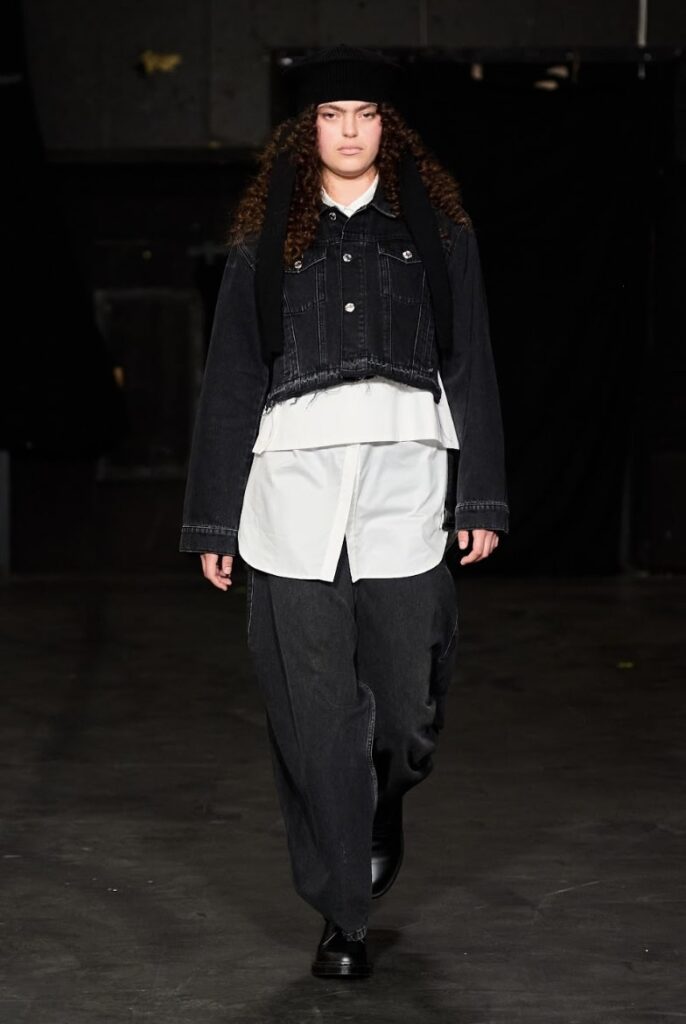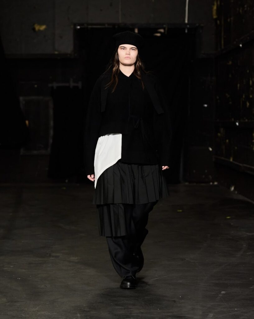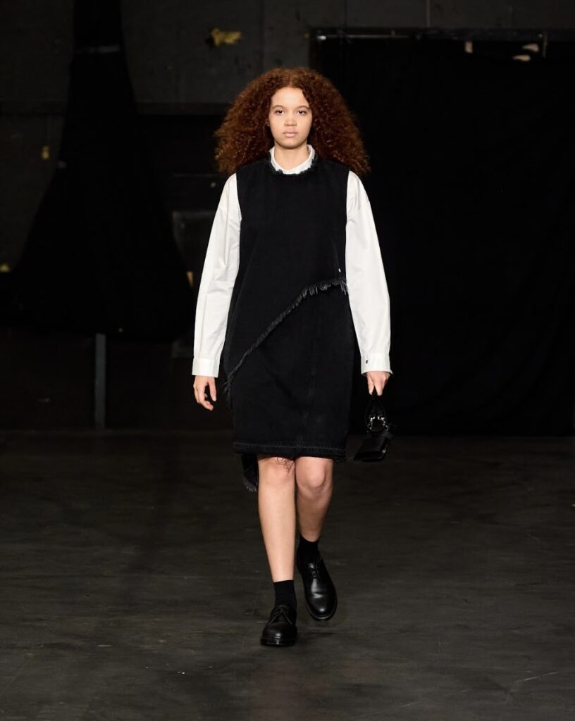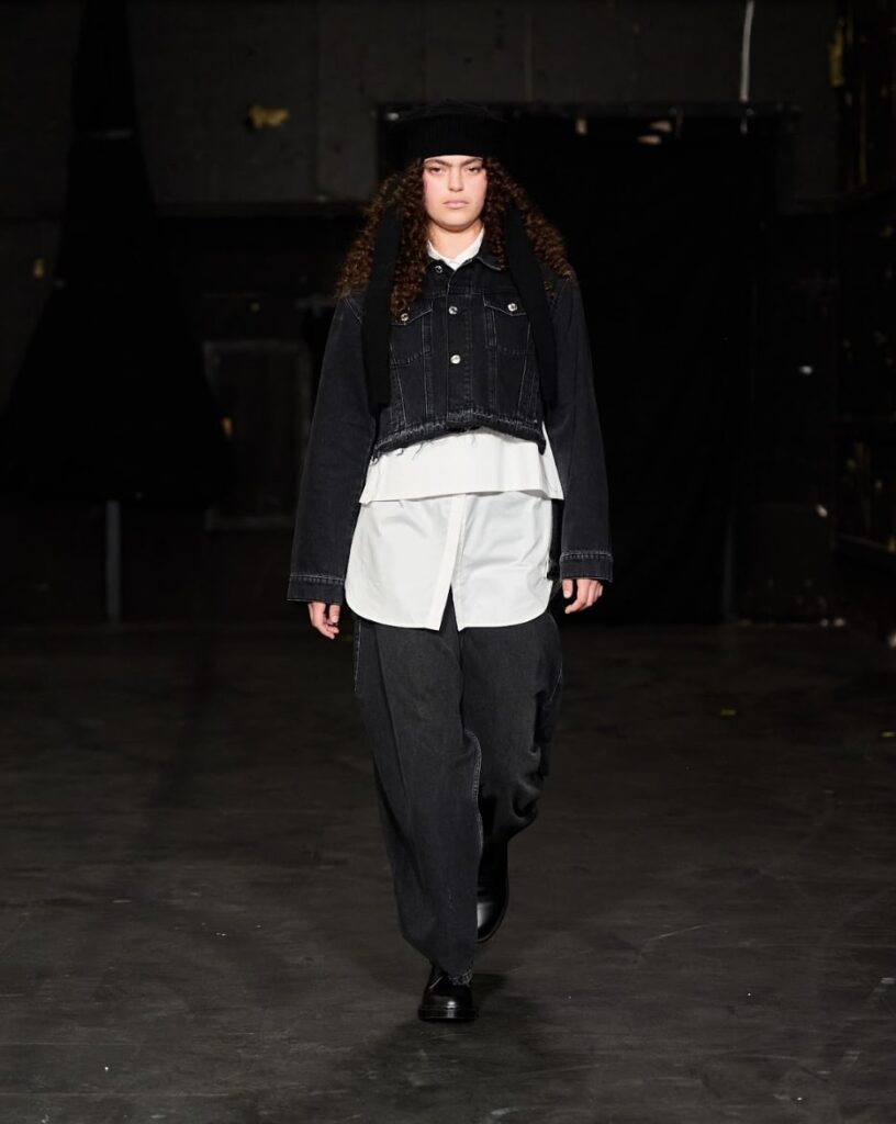 The presentation itself unfolded like a movie set: housed in a vast industrial space, the runway was a sculptural grid punctuated by streetlamps and ambient projections, including a scene from Peter Funch’s Babel Tales. Inspired by Ed Ruscha’s Street Meets Avenue, the show became an urban intersection where models and audience merged—observers transformed into participants in Andersen’s evolving world.
