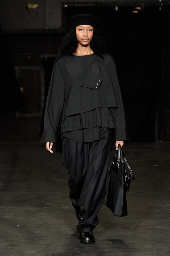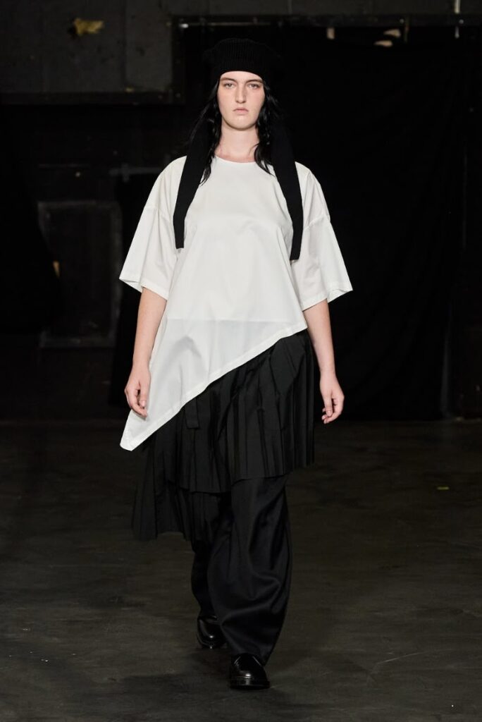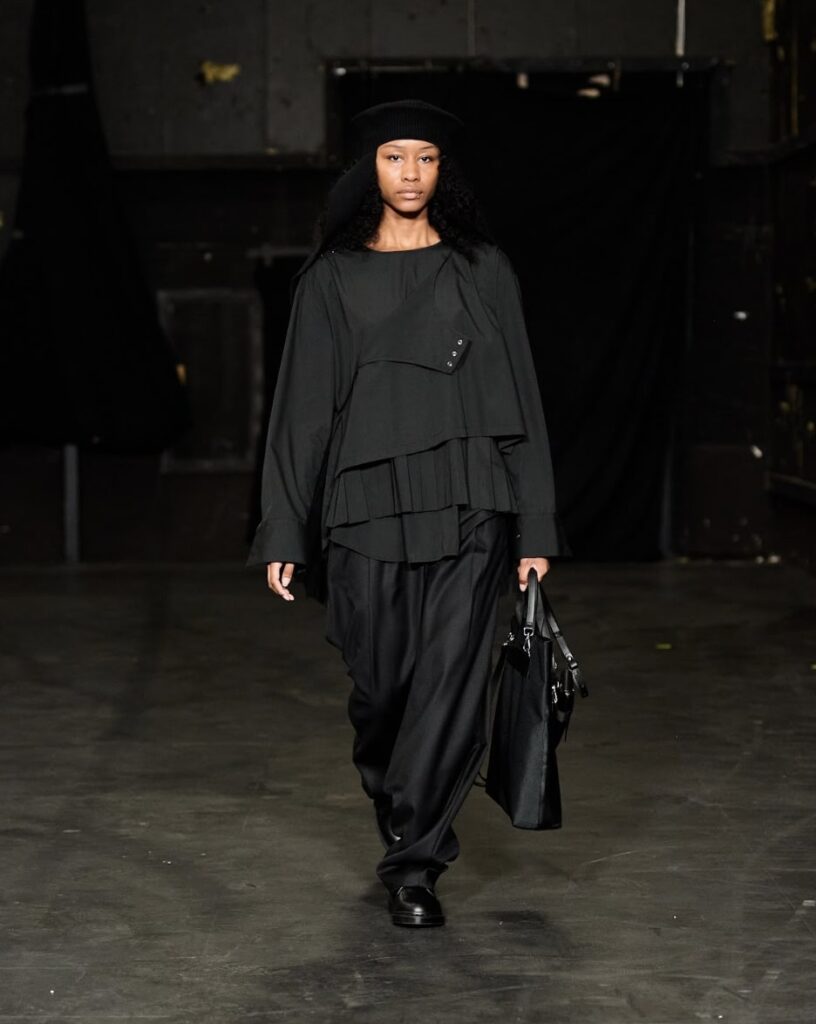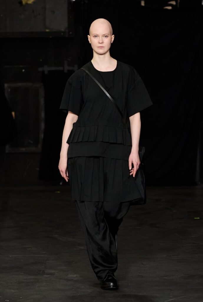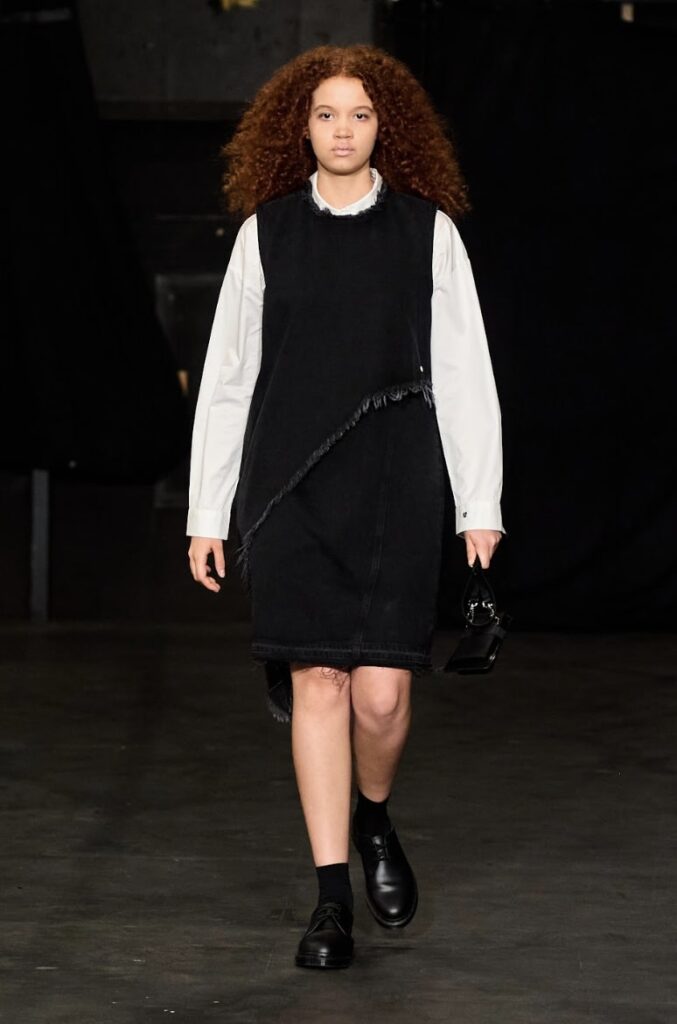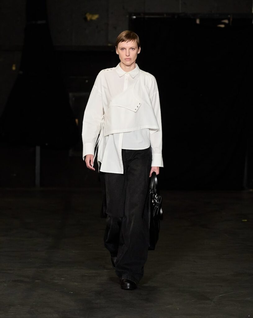 The presentation itself unfolded like a movie set: housed in a vast industrial space, the runway was a sculptural grid punctuated by streetlamps and ambient projections, including a scene from Peter Funch’s Babel Tales. Inspired by Ed Ruscha’s Street Meets Avenue, the show became an urban intersection where models and audience merged—observers transformed into participants in Andersen’s evolving world.