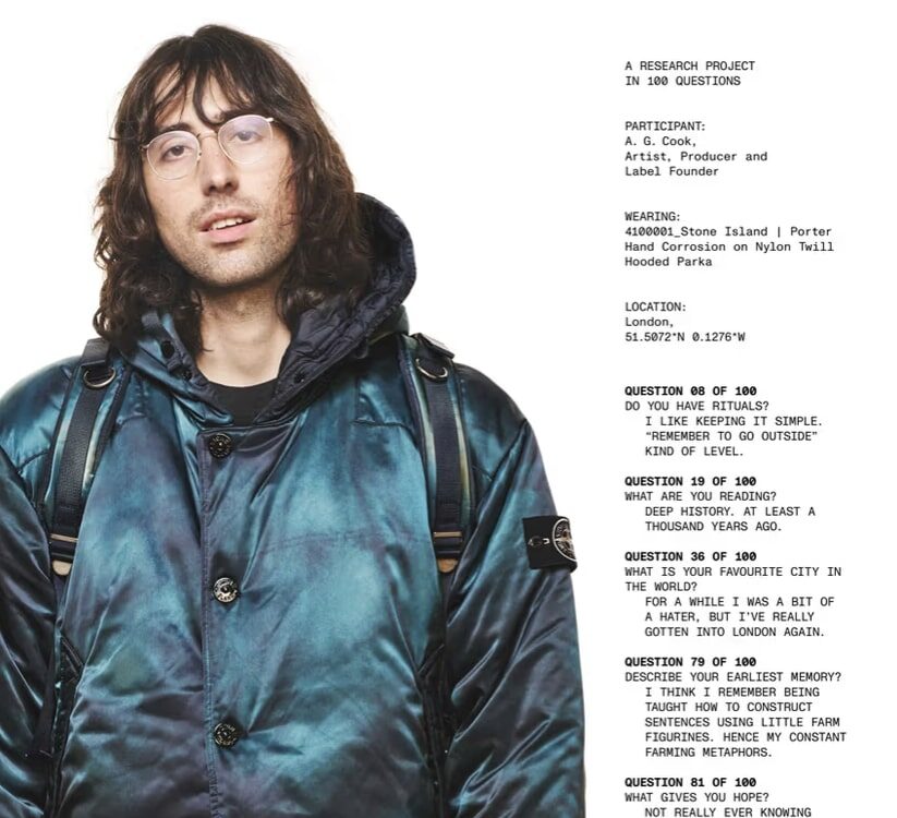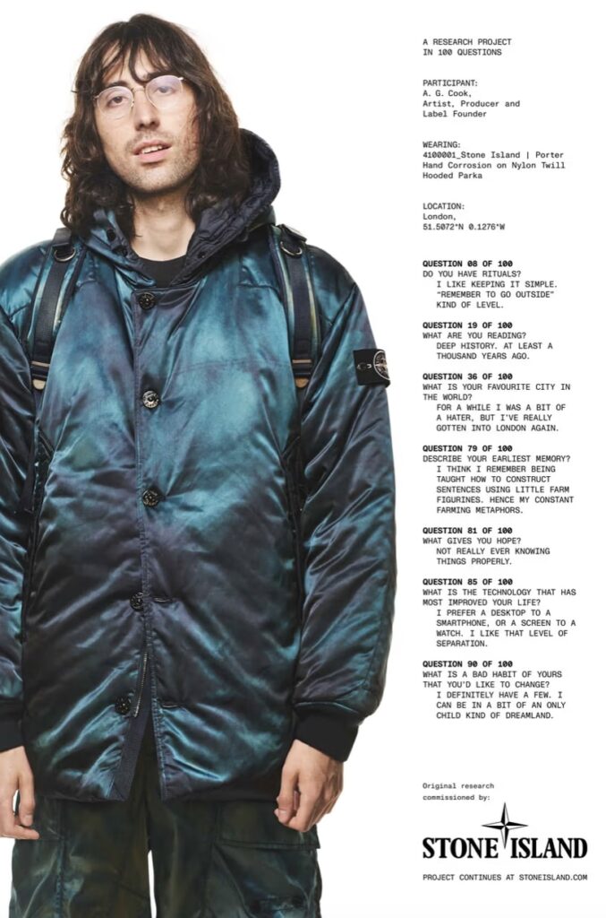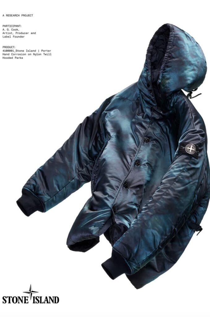 Rather than revisiting old templates, both labels use the anniversary as an excuse to show how far technical design can go. The collection debuts inside Stone Island’s ongoing “Community as a Form of Research” project, framed through a new visual language starring producer and digital-age shapeshifter A.G. Cook. Photographed by David Sims, the campaign places Cook in a pared-back setting that lets the garments’ construction speak for itself.