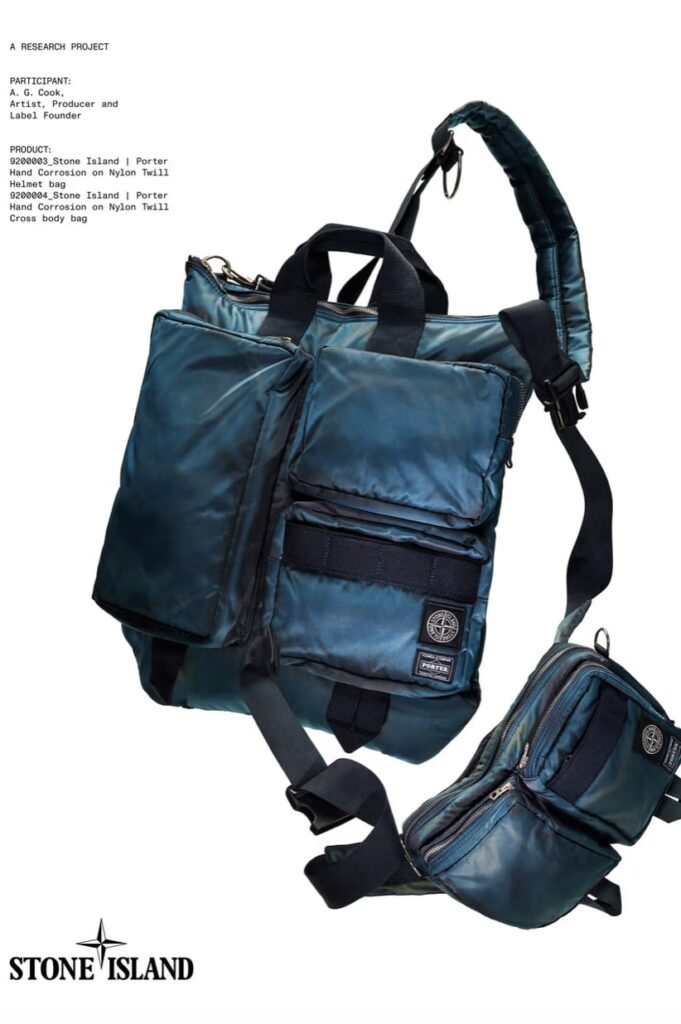 PORTER’s heritage comes through in a quartet of bags: a backpack, a helmet-inspired tote, a cross-body, and a compact pouch. While each piece nods to the brand’s utility-driven DNA, they’ve been reworked to sit comfortably within Stone Island’s experimental universe.
