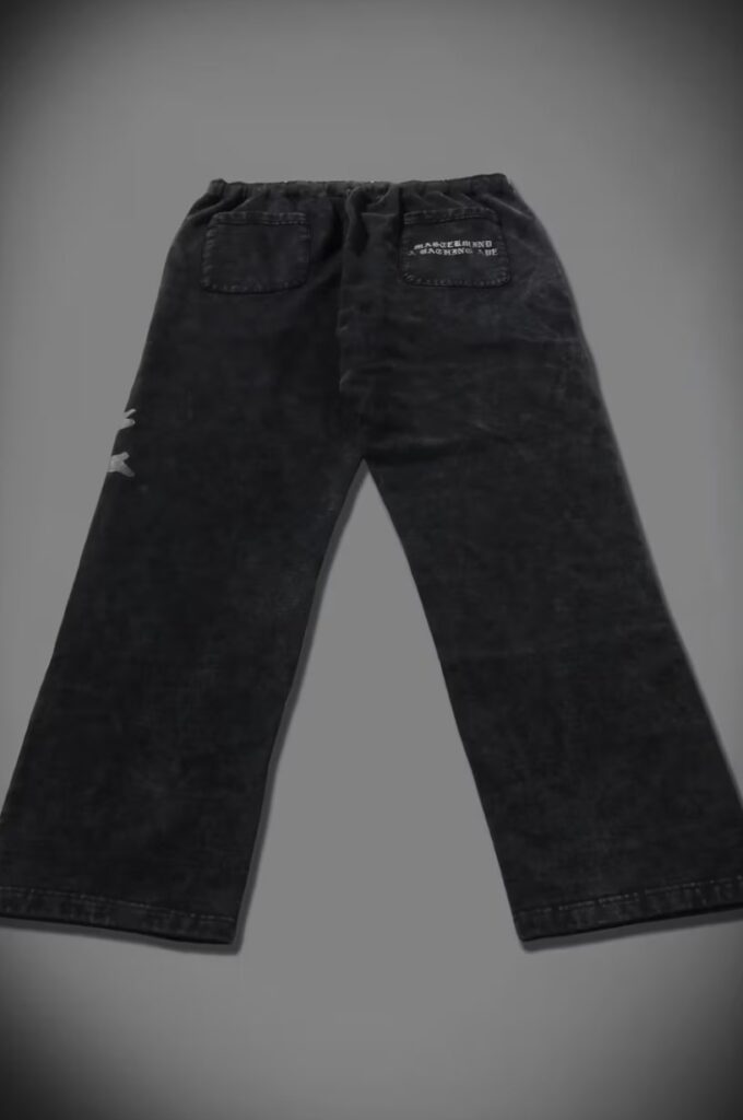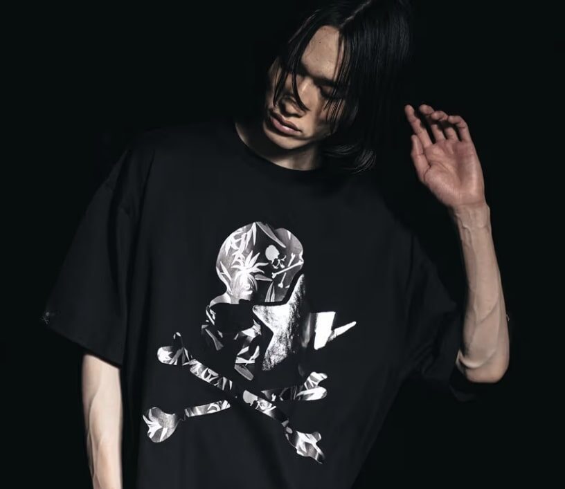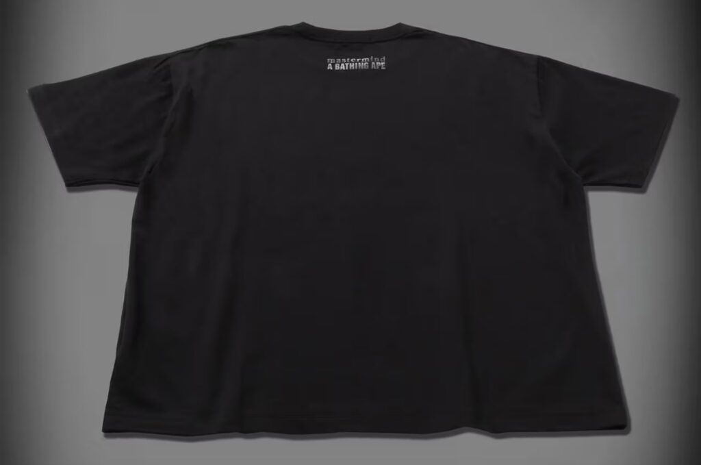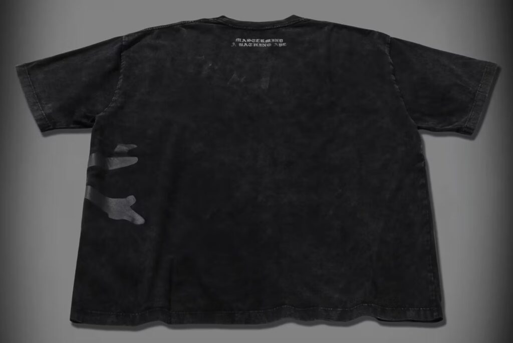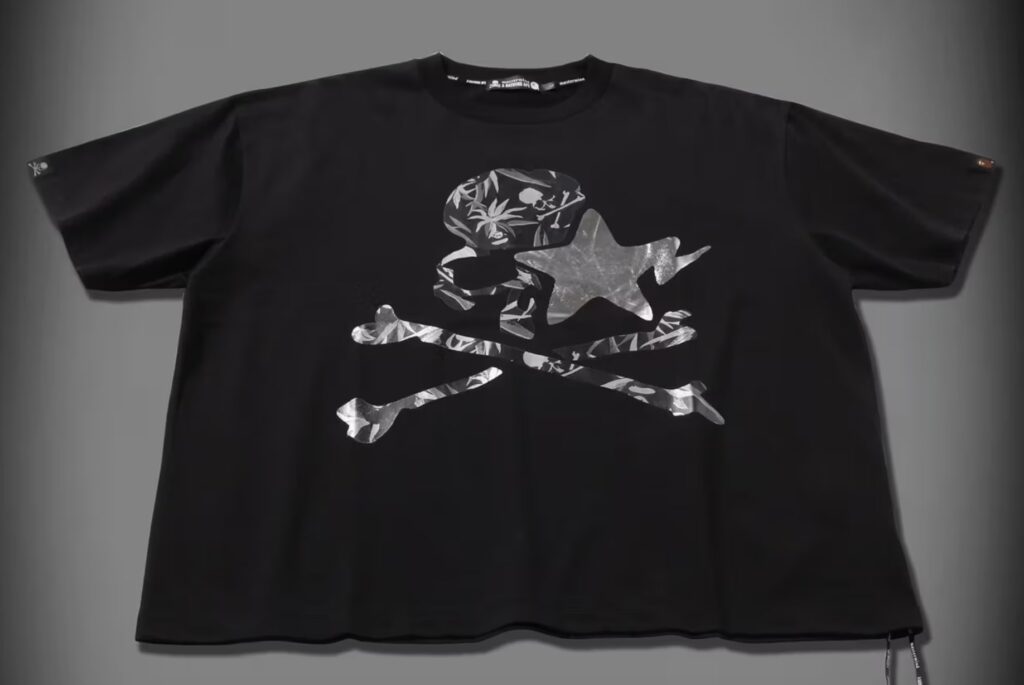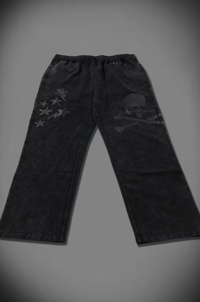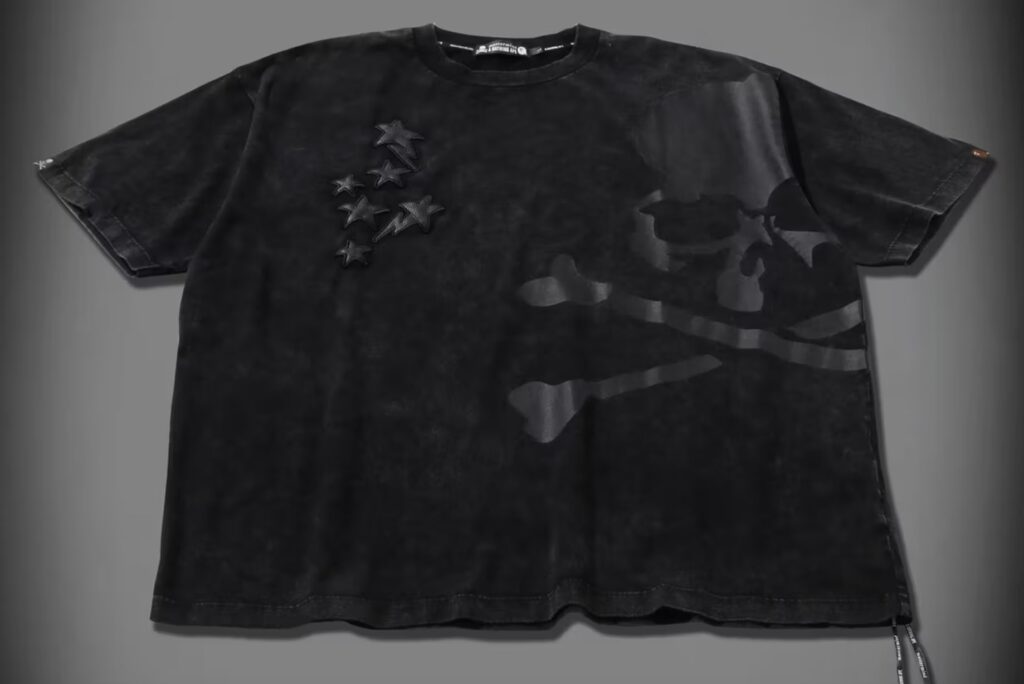 Elsewhere in the capsule, graphic T-shirts and trousers push the envelope further. Acid washes lend a worn-in texture, while tonal black graphics and unorthodox lacing details subvert streetwear norms. Motifs shift and recombine — sometimes layering BAPE’s star with mastermind’s skull, other times isolating each symbol on opposing panels, keeping the visual storytelling dynamic and asymmetrical.