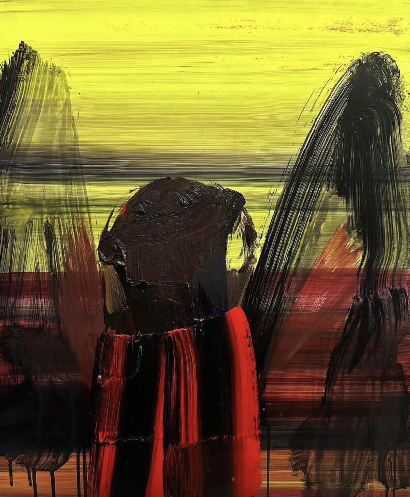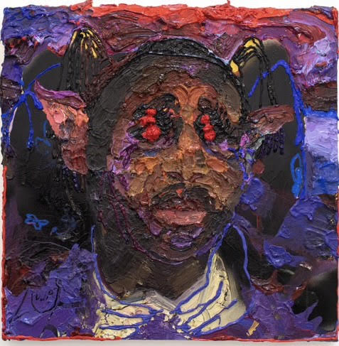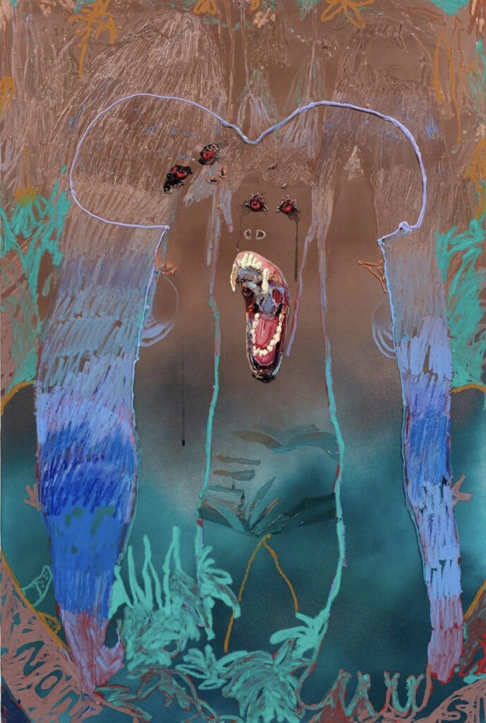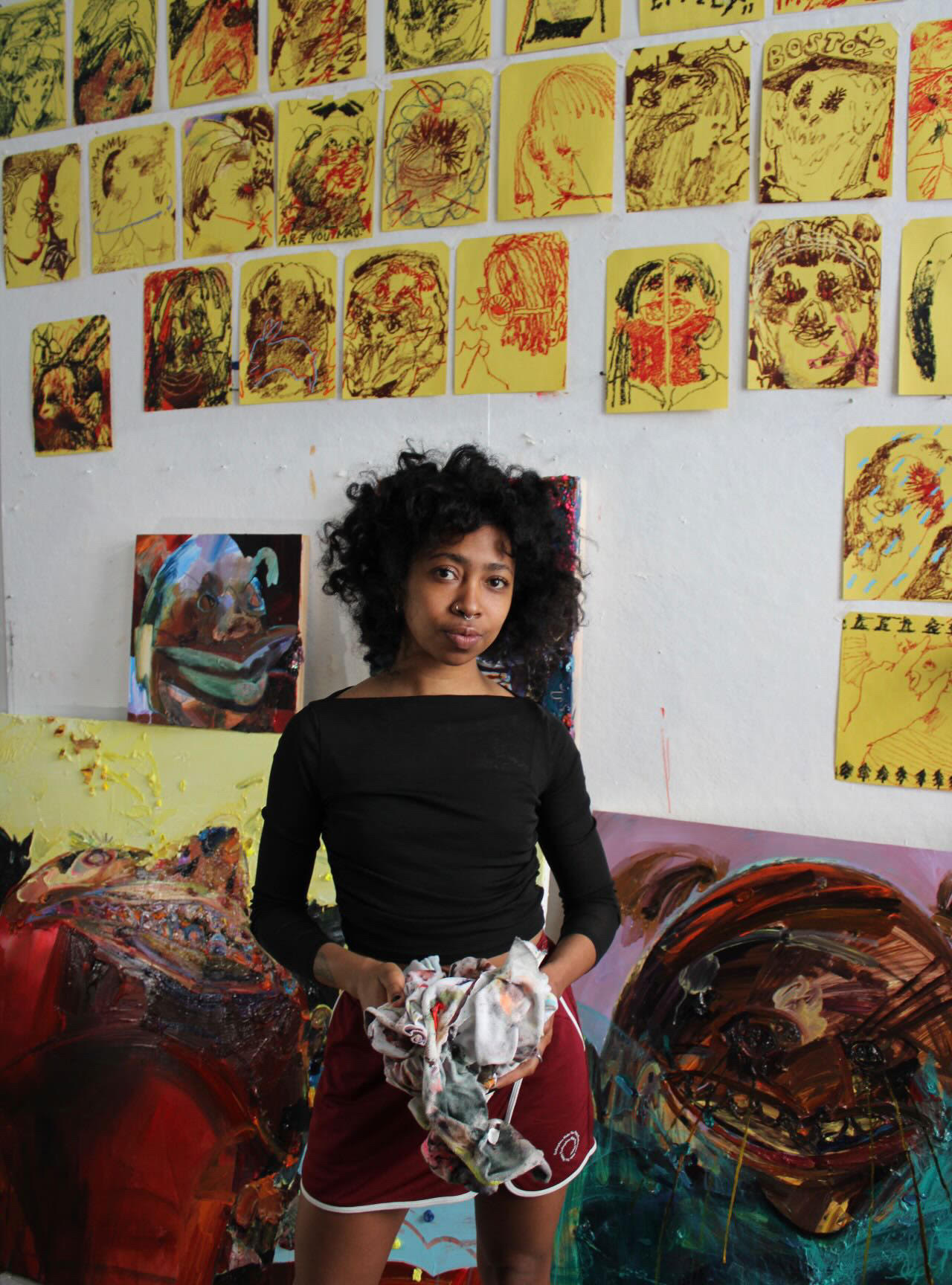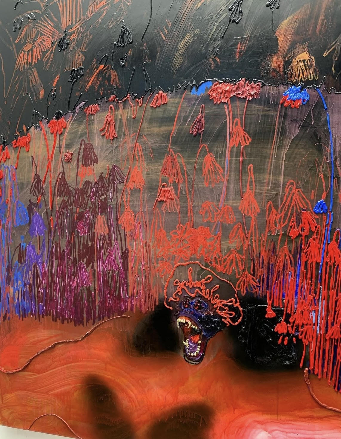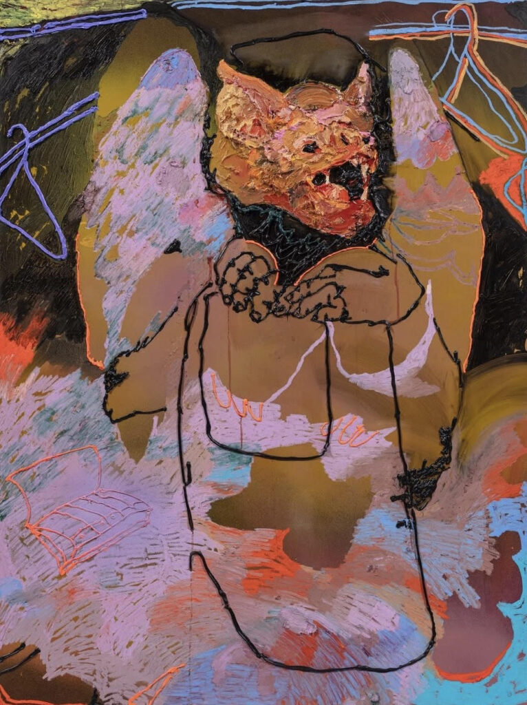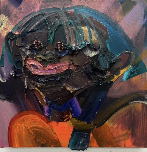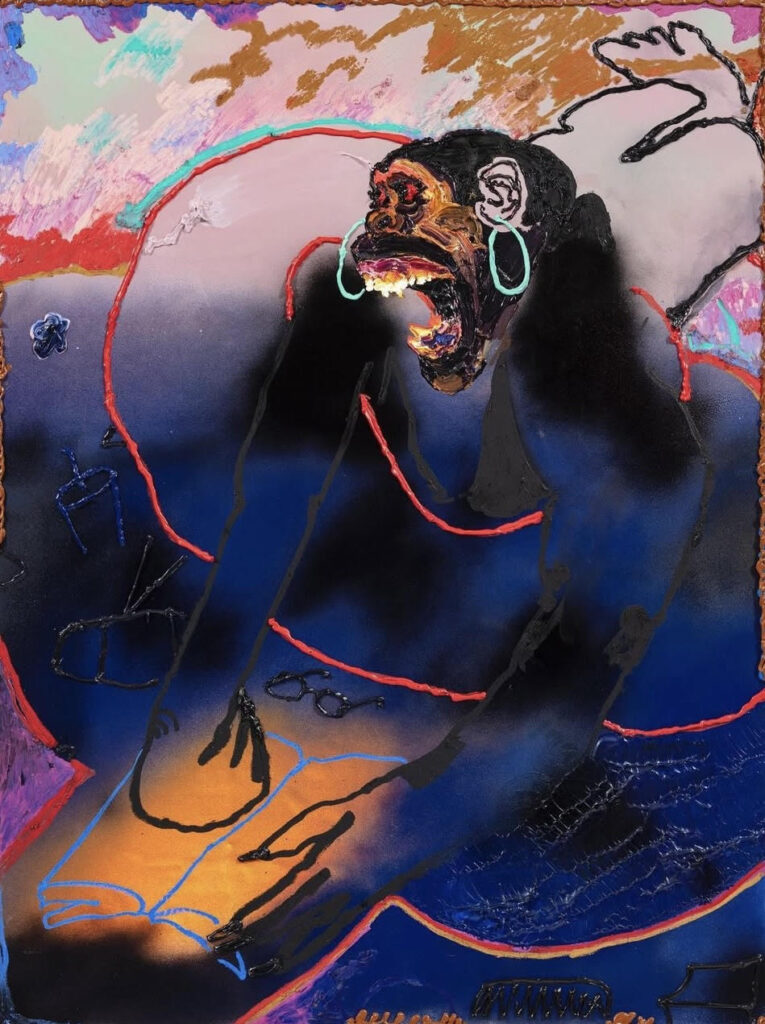 The portraits and figurative painting practice of Bianca Fields manifests a tangible embodiment of repression and mental captivity. She explores this idea with competing forms of archetypes on a slick primed surface, creating a supernatural essence of anguish and isolation. Often in her work, Fields highly renders a candid mix of her vigilant portrayed primates, utilizing her feminized beasts as formidable stand ins for her imagined self. Painting wet-in-wet directly into the mouths of her subjects, she creates allegories of ritual and beauty under the beholding of the misogynoir, seeking to investigate the vicious cycle of emotional truths, abstract sense of self and violence.