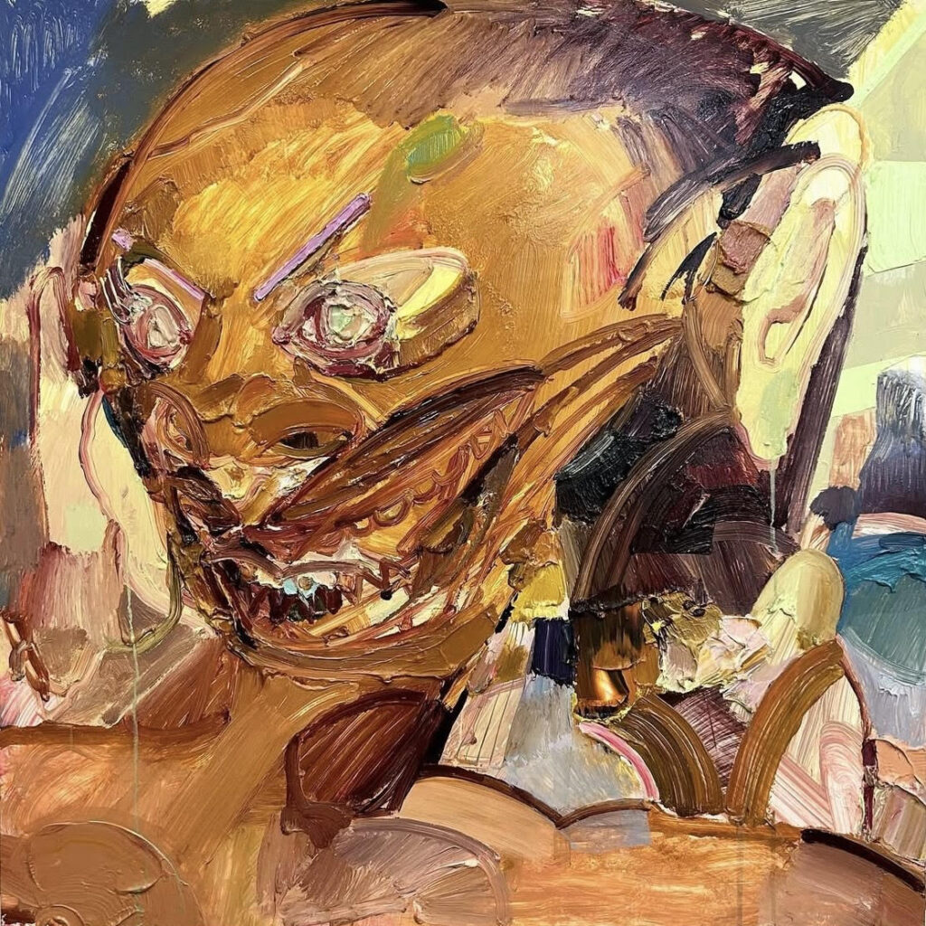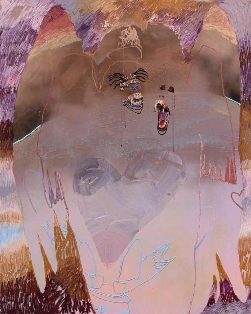 Bianca: Yes, I often think about the interior and how it is being materialized into the exterior world. Like social media. Parasocial relationships and preferences being heavily reliant on a sense of acceptance, intimacy and relatability. I am also thinking about gut instinct and how it is fundamentally an external response. It’s also just an opportunity to part ways with something that could be considered unsafe. I think about this in the context of the Lacanian term, Extimacy, being that our most intimate feelings can be externalized onto objects or others while still remaining deeply personal. Extimacy comes to mind especially when thinking about placement: where the more tactile, high rendered moments exist in my paintings — as opposed to conceptually, the more omnipresent qualities that may be felt, but not entirely distinguishable. I always come back to the portrait. The honest portrait in my work is located in the mouths of my subjects; the mouths being an unresolved, moist atmosphere that has no obvious form, no real understanding of its interior, but produces language. I also like to think a lot about thickness and flatness in my work. I view flatness in my work as being reductive and thickness as a more complex, surveilling and self aware entity. Especially in the context of shaping how us female painters are understanding ourselves. I think to be a female painter it is nearly impossible to depict rage or aggression without factoring some level of gendered societal oppression. There is ambiguity and obliteration in the way I depict, but emotionally I want clarification and reassurance.