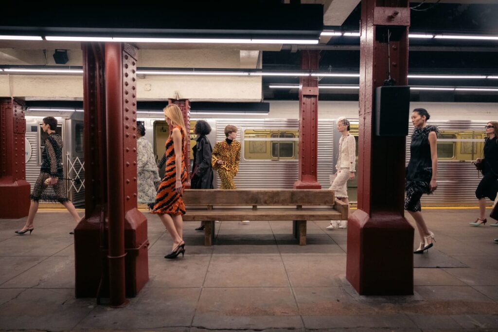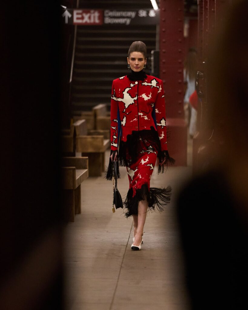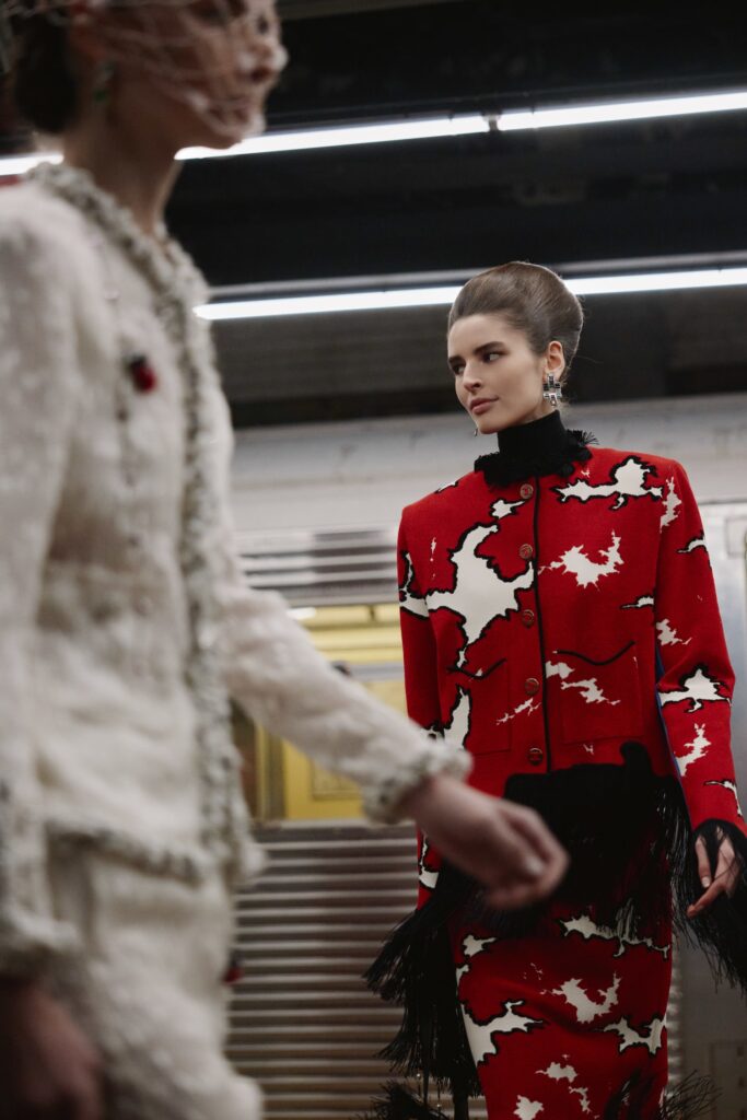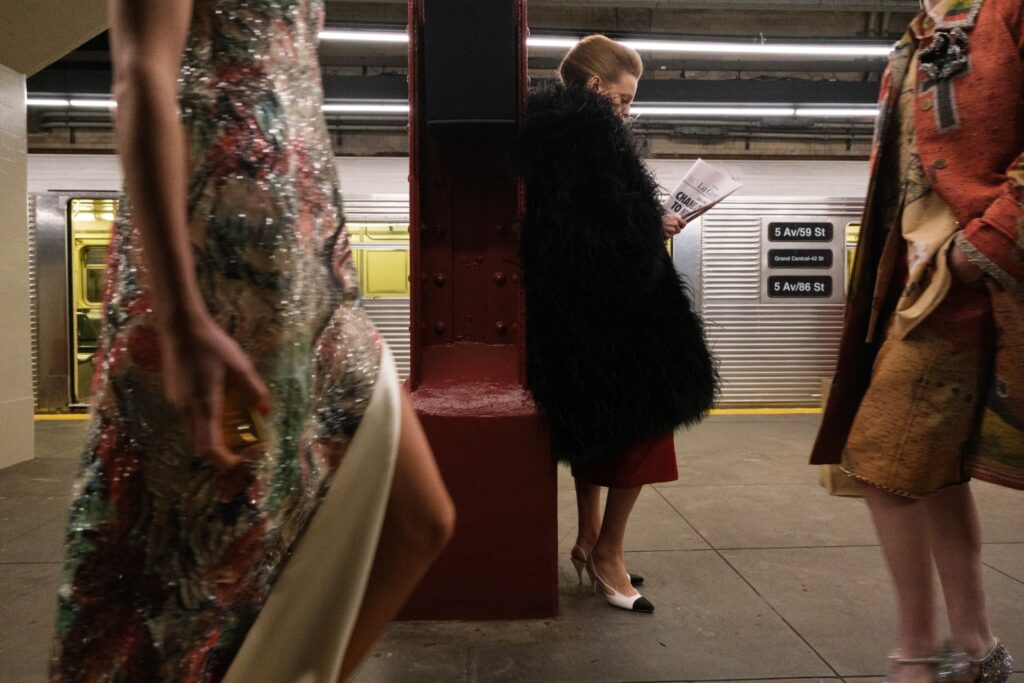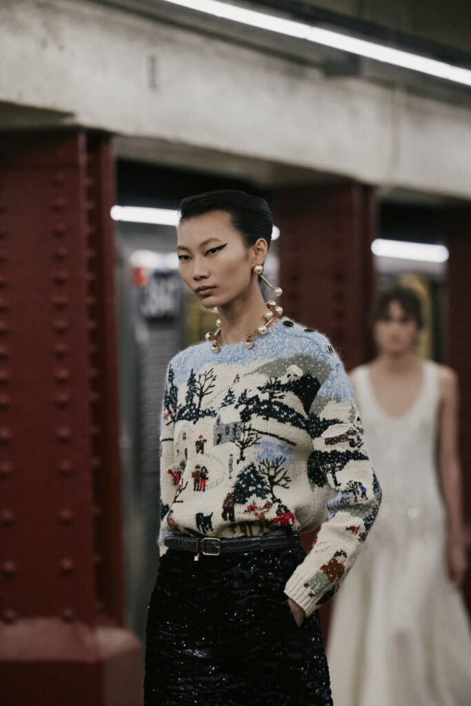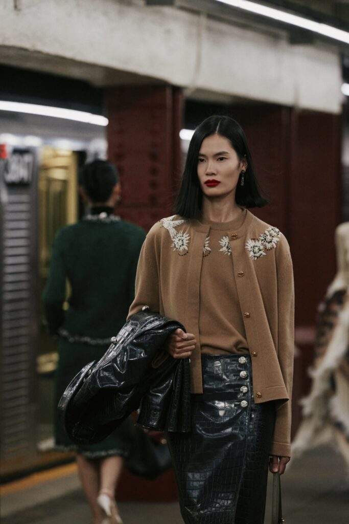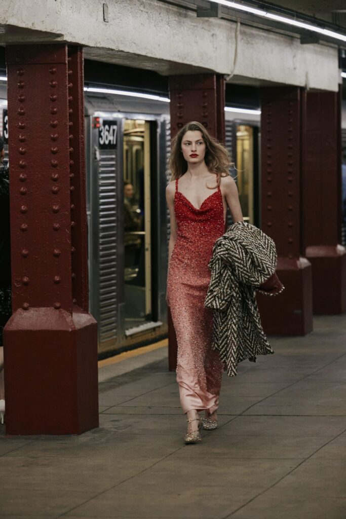 The Maison paired the physical presentation with a new digital platform, giving the public a deeper look into the collection’s textures, references, and the artisans who bring Métiers d’art to life. But the heart of this year’s narrative lies in the subway itself — that democratic artery where students, activists, politicians, tourists, and teenagers share the same fluorescent-lit tunnels.