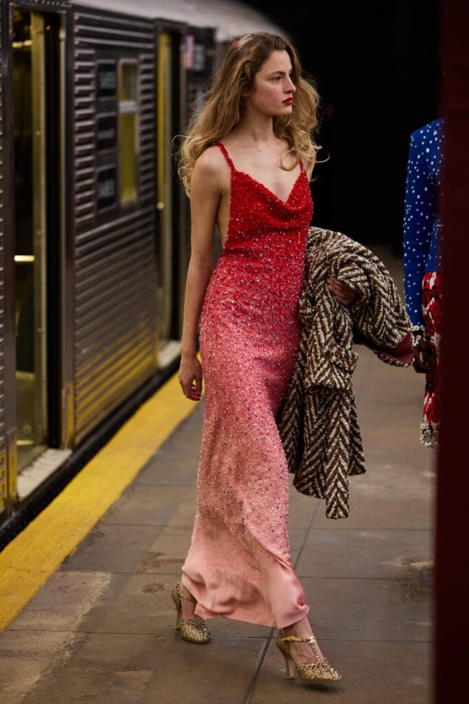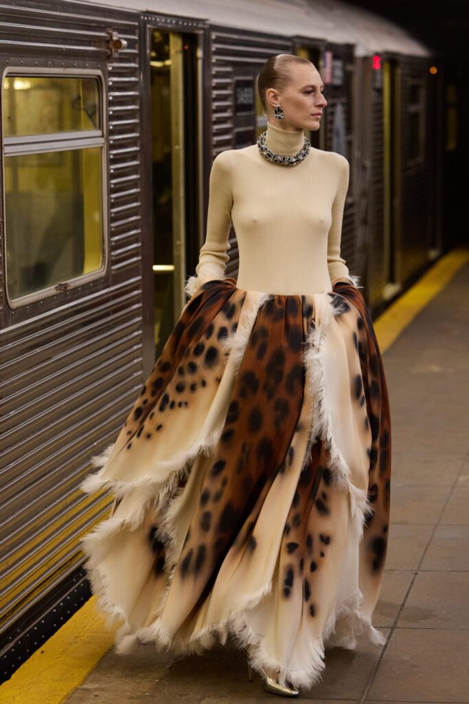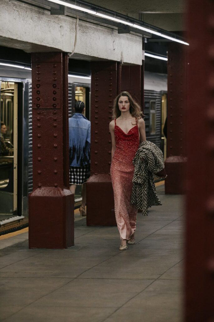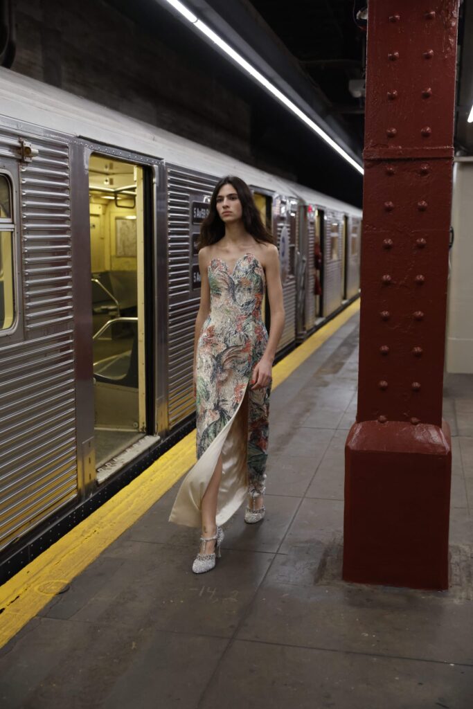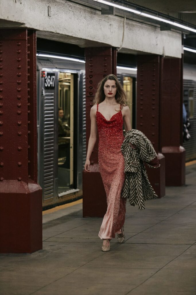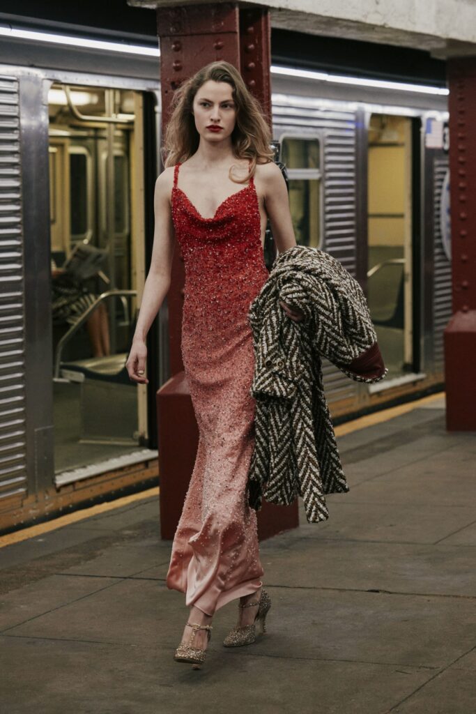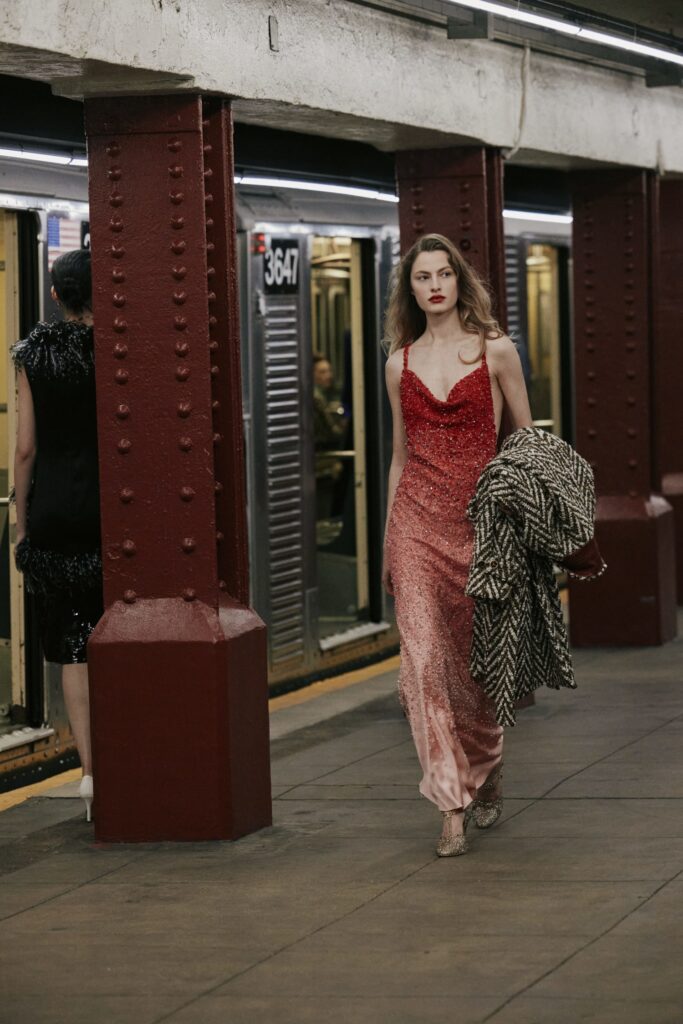 This season, that heritage collides with subway iconography: a reminder that couture techniques don’t have to sit on pedestals — they can move, rush, merge, and breathe like the city itself.