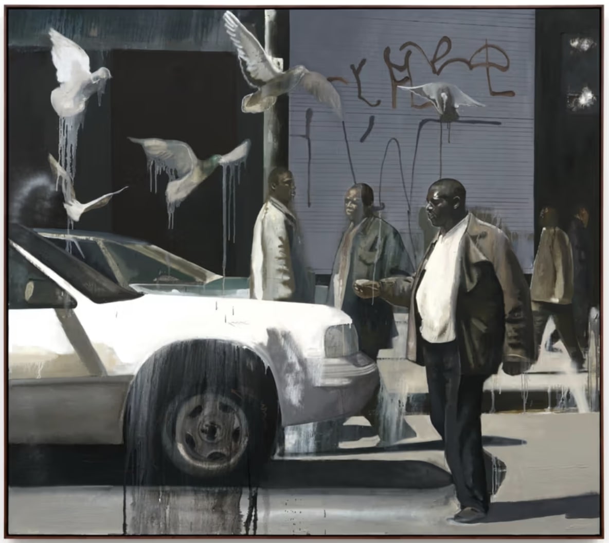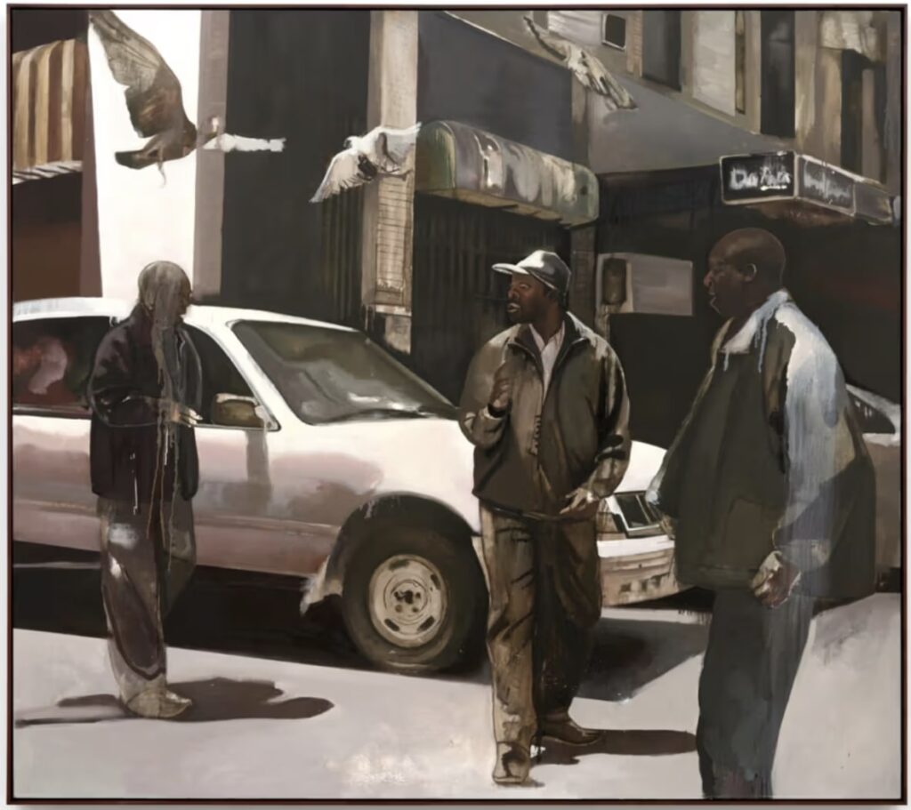 Among the standout works are “Mirror Rehearsal,” the exhibition’s opening piece, and “Harmony & Discord,” a painting steeped in deep wine tones that evokes emotional gravity through tension and balance. The more abstract “Bus Stop” and “Creep” push further toward dissolution, while the titular “Crossing” offers a fleeting cityscape filled with birds in flight and vintage cars, symbols of momentum and transience beneath a shroud of mystery.