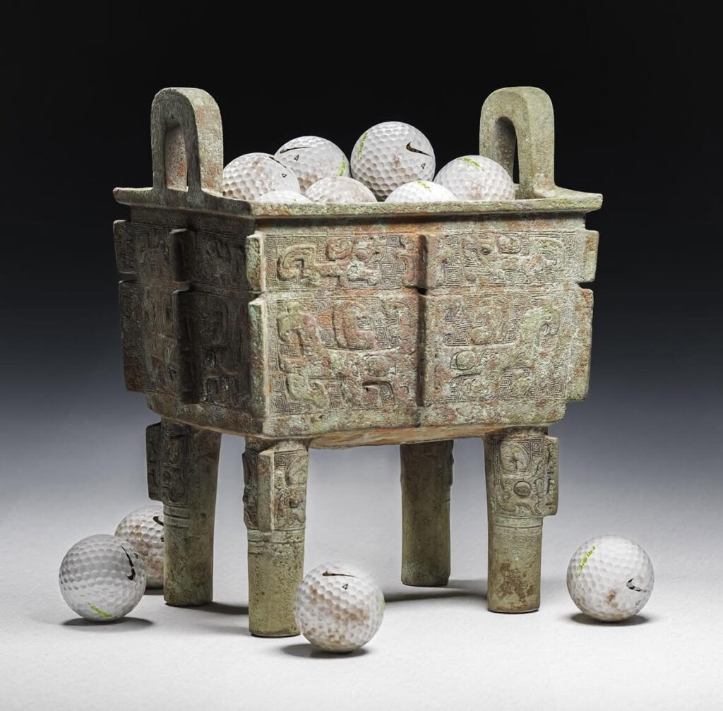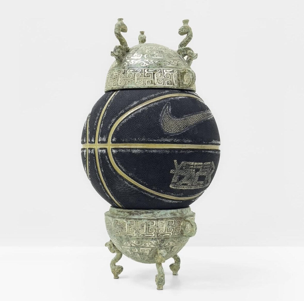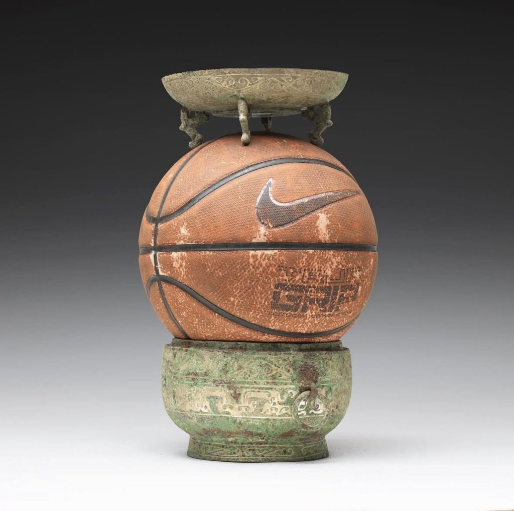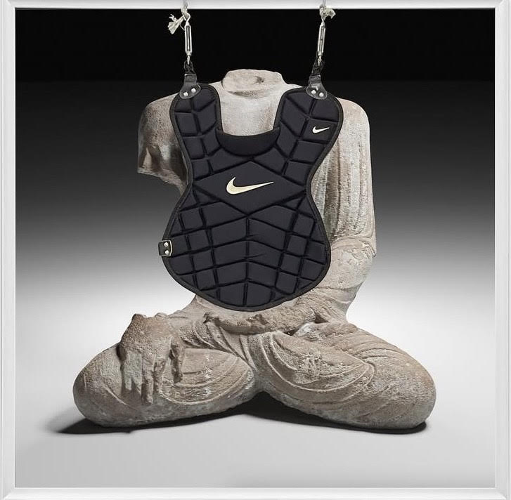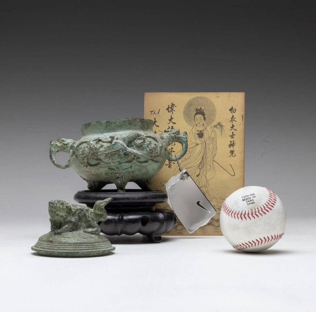 Your work often mashes up sacred relics—like antiques—with modern consumerism, like Nike logos. What’s the story behind your favorite “cultural accident” that you’ve turned into a piece?