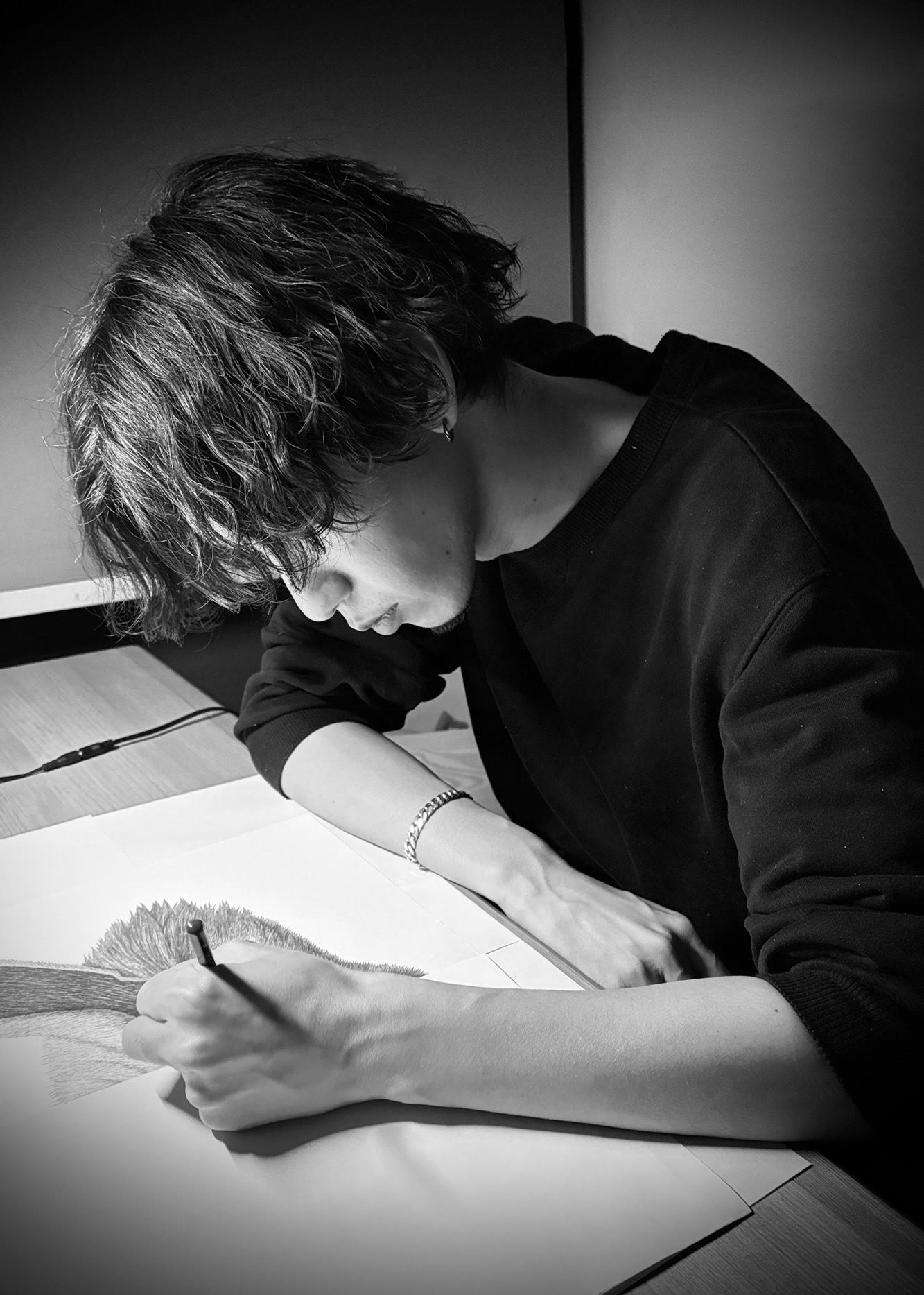 Shinnosuke: Not really. Drawing in graphite requires precision and pressure— I can’t erase everything. That tension combined with my childhood love of drawing might naturally create that duality.