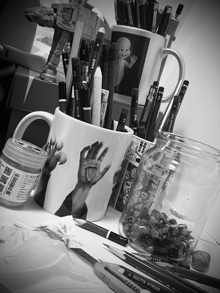 Shinnosuke: I don’t really have a strict routine. I usually wake up around noon, have some coffee and a cigarette, and then draw from night until early morning.