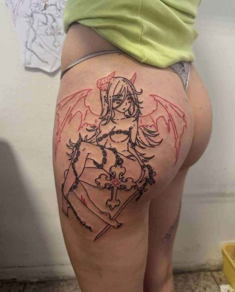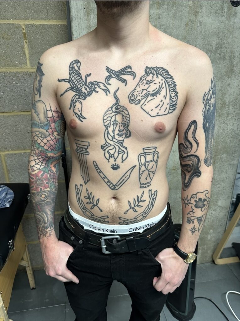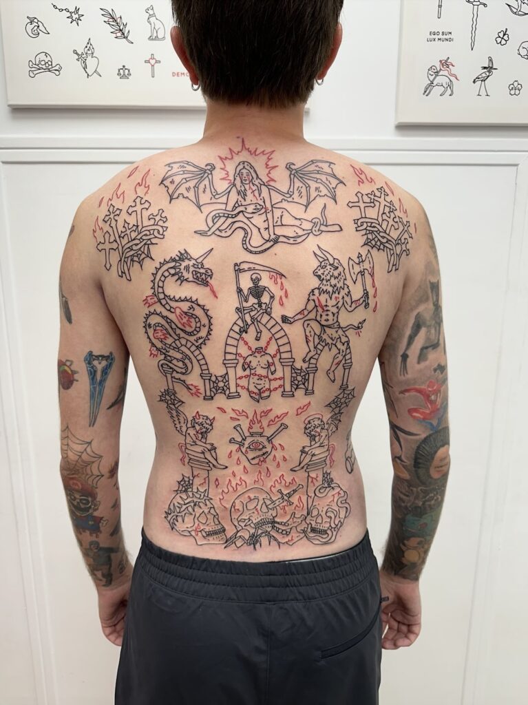 His work is defined by solid lines and clear designs. Furthermore, in his tattoo style there is a combination of different references, from ancient art and history, like mythology and medieval art, Japanese manga culture as well as the fact of growing up in the 90’s, to