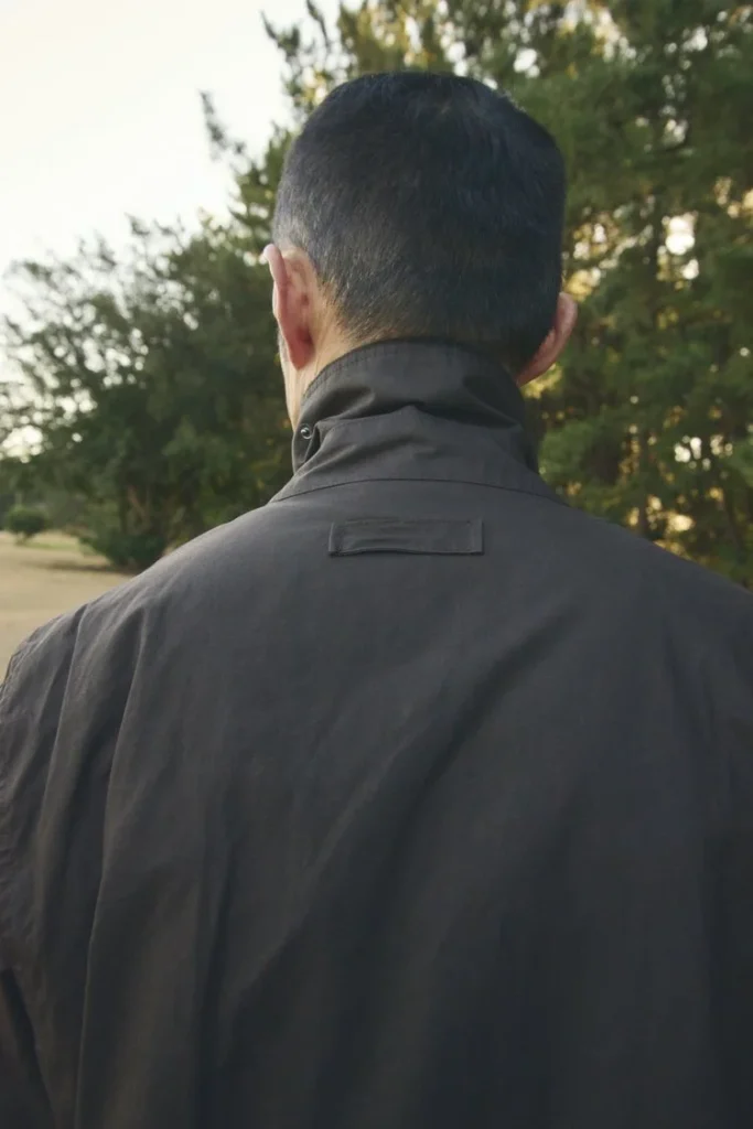 The capsule distills this dialogue into two outerwear pieces that feel purposeful without being precious. The Transport Smock reinterprets a turn-of-the-millennium Barbour silhouette as a pullover blouson, cut from dry wax cotton and paired with a detachable vest. It’s a garment that suggests movement and adaptability — protection without bulk, structure without stiffness.