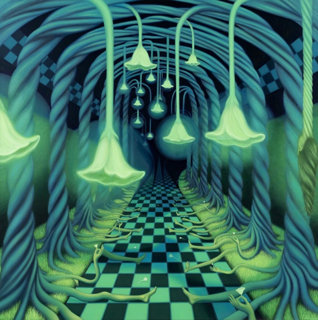 Katia: Yes, they’re part of a personal vocabulary I’m developing. Motifs like plants, light and darkness, night, paths, spirals, play with perspective and bioluminescence recur throughout my work. These motifs are tools to explore ideas of growth, transformation, and the hidden forces shaping our inner worlds.