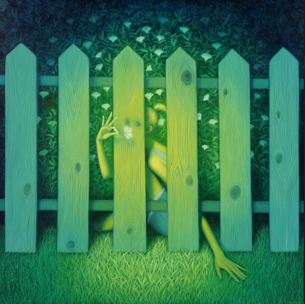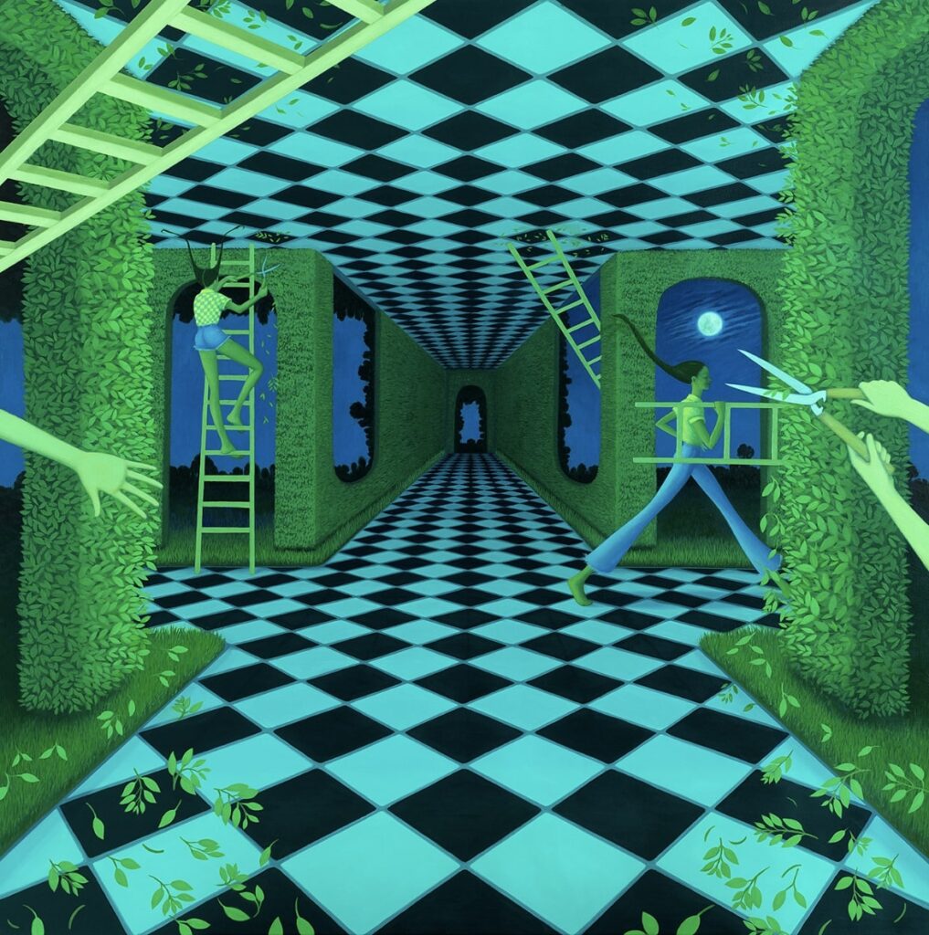 The spaces I painted are essentially symbols of the landscapes of the mind. We build prisons in our minds, but we also build escape hatches. In ‘Synaptic Pruning’, the girls are trimming hedges that cage them in, but the twist is, they’re the ones who shaped them. It’s about self-imposed limits, and the freedom that exists within those confines.