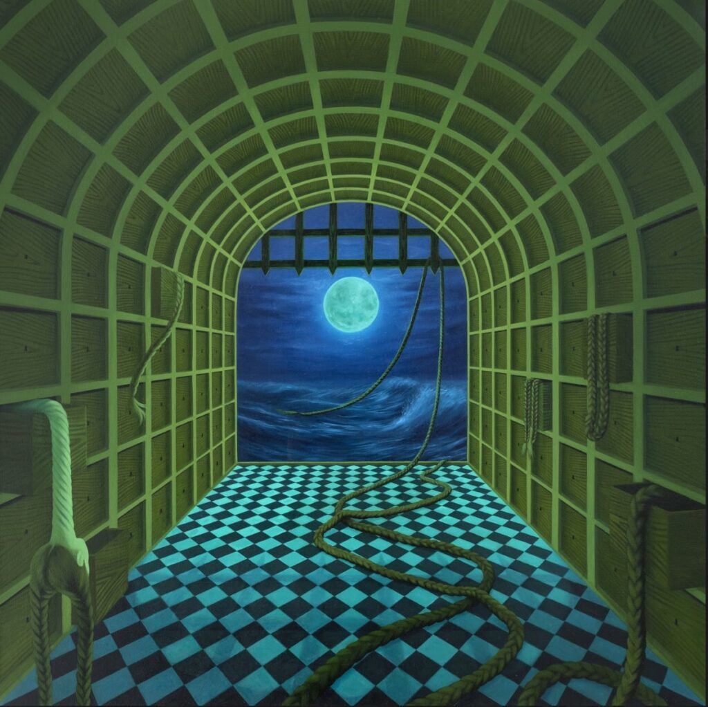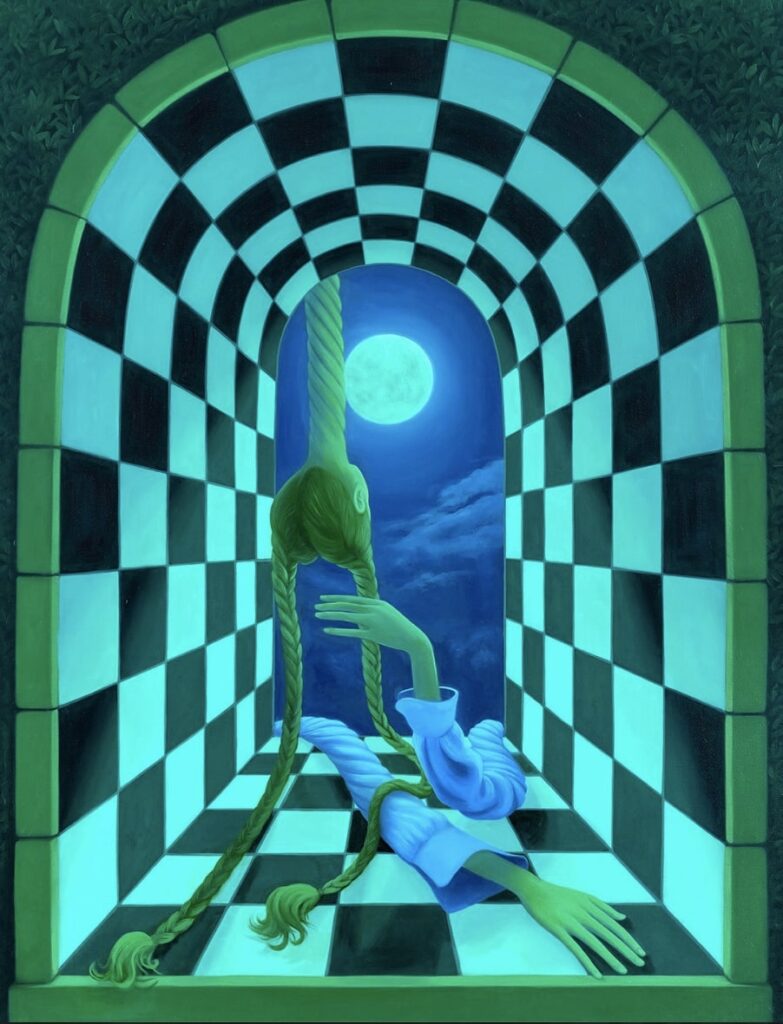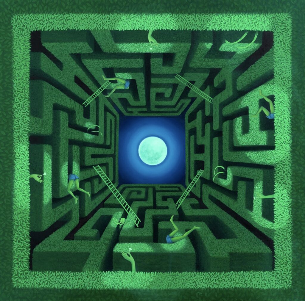 Your paintings are filled with recurring motifs—labyrinths, moonlight, scissors, surreal vegetation. What personal or symbolic meanings do these hold for you?