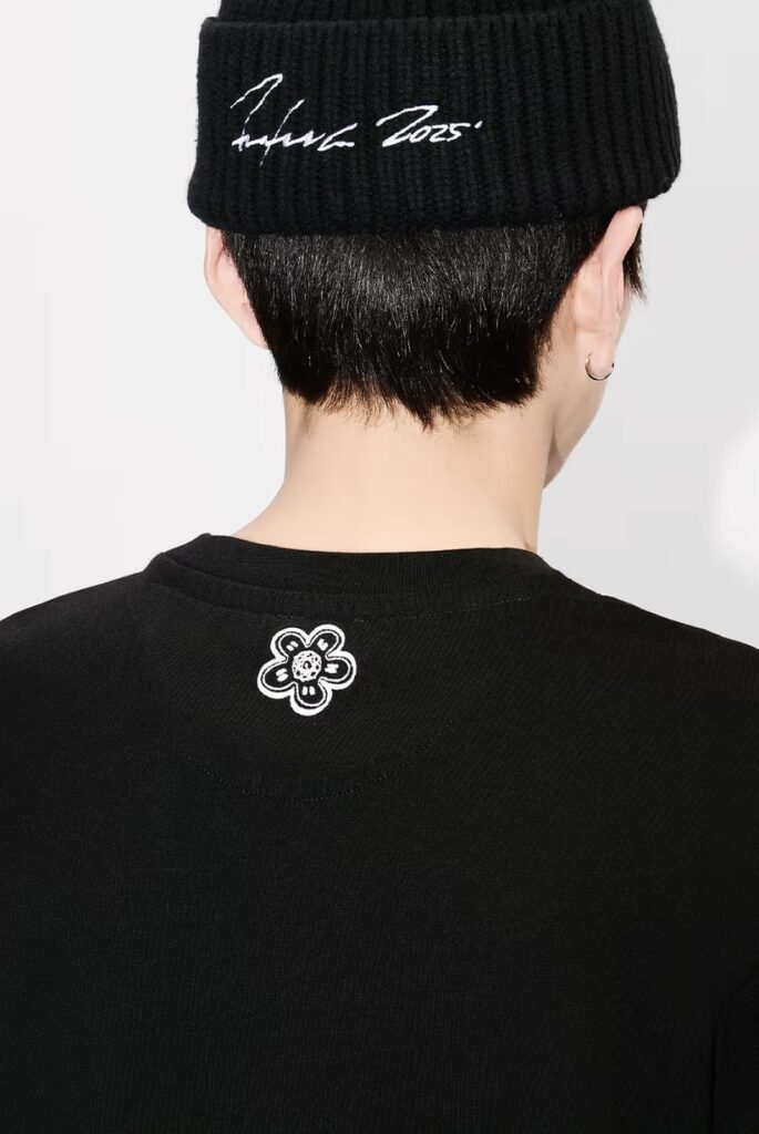 At the heart of the collaboration lies a collision of symbols—Futura’s “Pointman” figure, first introduced during the artist’s groundbreaking work of the 1980s, meets KENZO’s Boke Flower, an emblem of the house’s new era. The result is an unexpected conversation between form and identity, where hand-drawn typography, rendered in Futura’s signature script, reimagines the KENZO Paris logo with a distinctly urban edge.