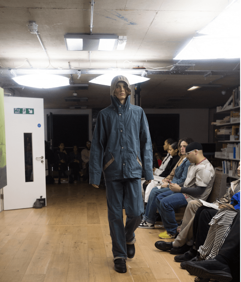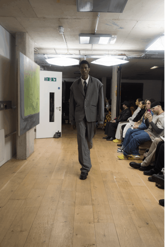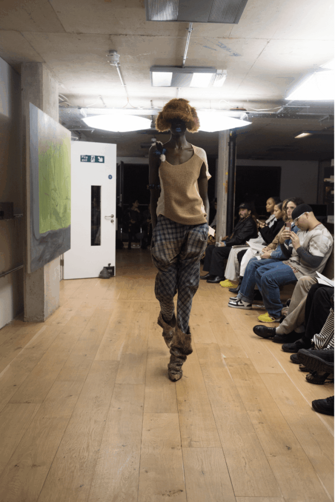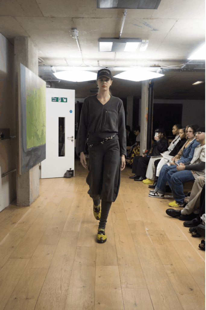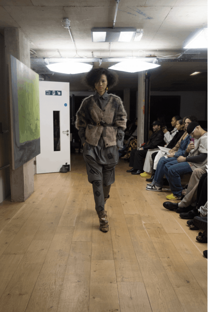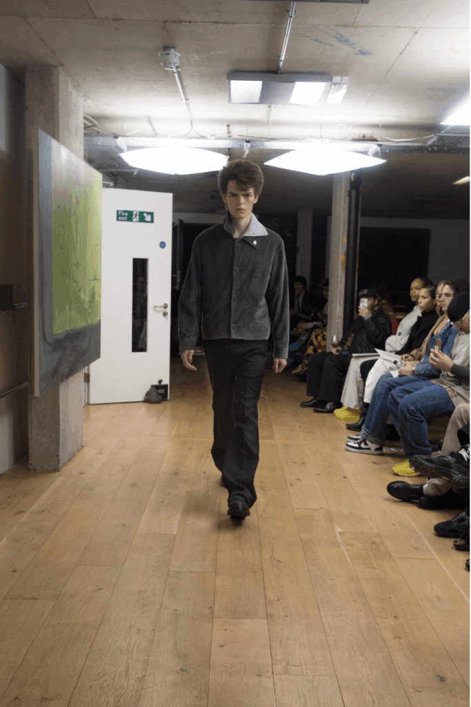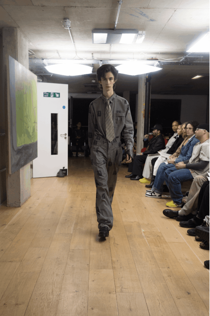 Presented in Kostadinov’s Haggerston studio, the show closed with the reveal of a Made in England collaboration with Dr. Martens, scheduled for February 2026. Using reclaimed leather, the capsule features green suede lace-ups and black velcro work shoes, encapsulating the spirit of function, craft, and eccentric British elegance that defines DANTE.