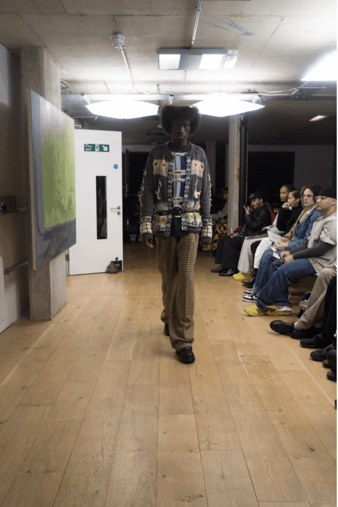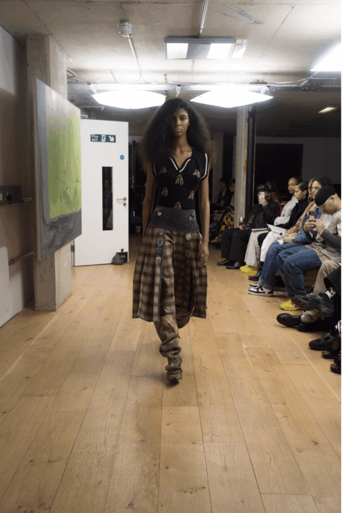 The womenswear line, presented for the first time alongside menswear, follows a similar rhythm of refined distortion. Riding suits morph into hybrid garments with leather patches, split shirting panels, and soft cashmere knits shaped by asymmetry. Gradient tartans, Aran textures, and double wool slip dresses merge countryside tradition with a subtle sense of rebellion.