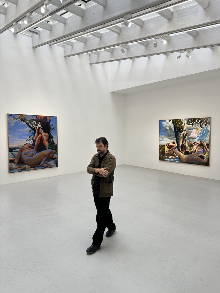 When I met Laurent Proux at Semiose Gallery, in Paris, where his solo show The Nature Poem runs until October 11, the paintings felt at once lush and unsettling — bodies folding into light, shadow, and wilderness, as if the human form were dissolving back into the world. Talking with Proux was as rewarding as walking through the exhibition itself: generous, layered, and full of strange connections.