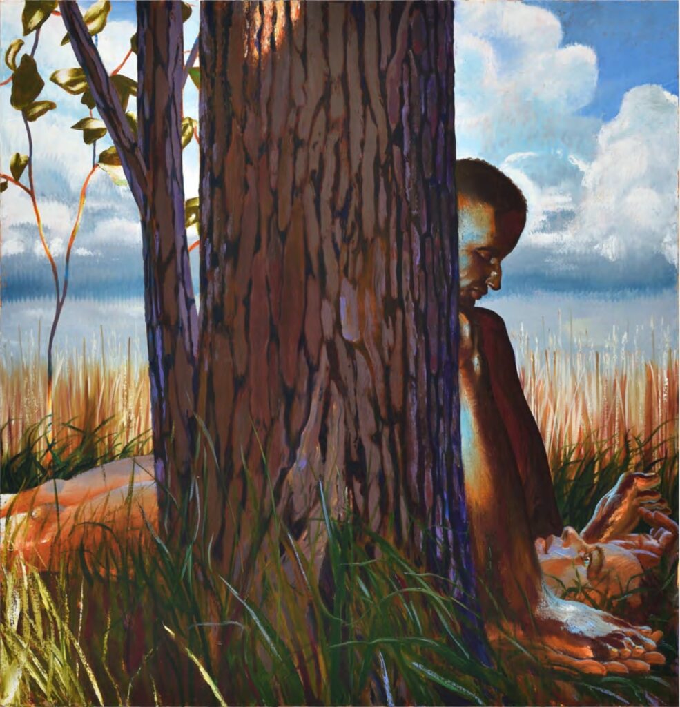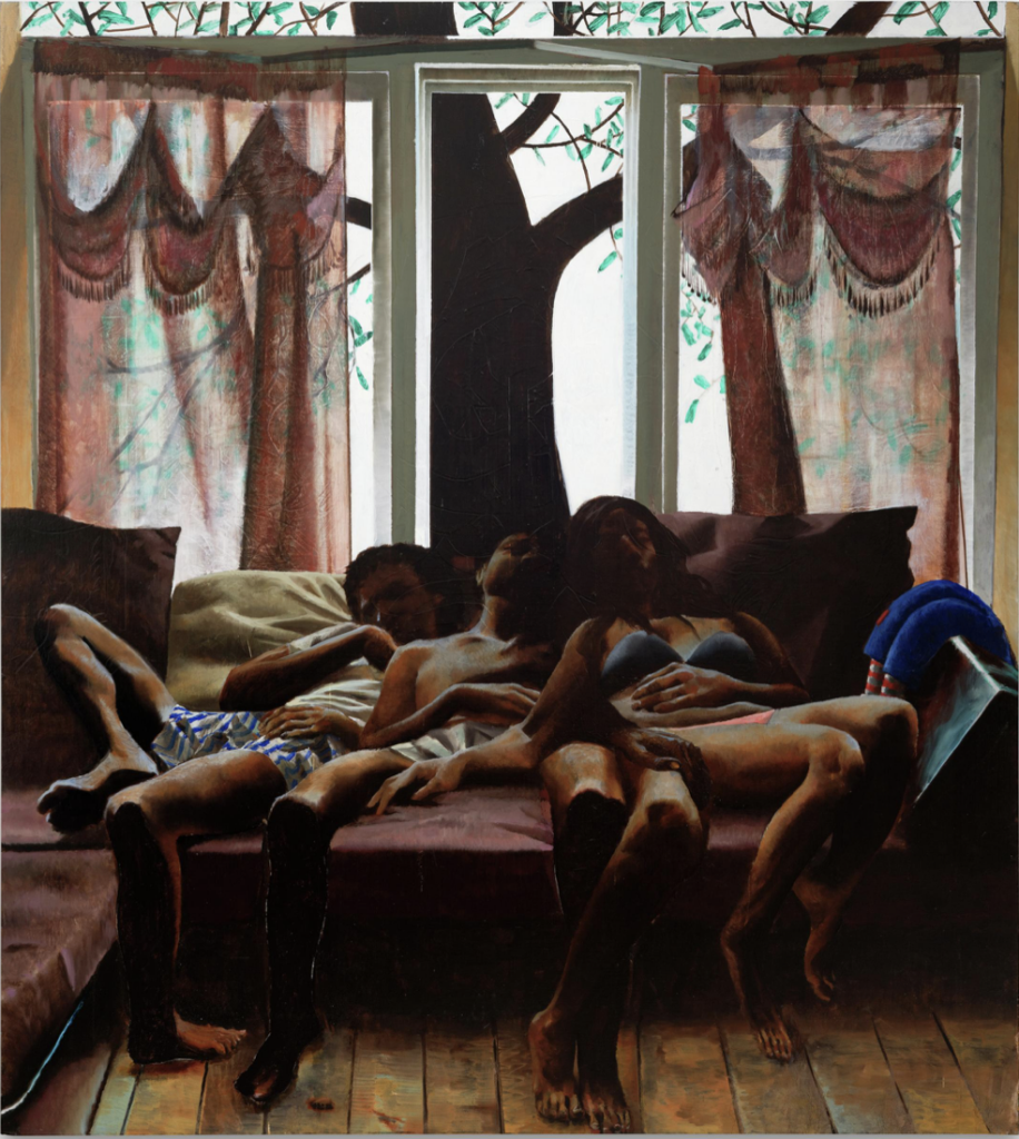 Laurent Proux: People were seeing the factories depicted into my paintings as ghostly, but for me it was full of evidence of human activities. Even machines were here to reflect the human being. I felt that I’d overlooked this in my work, so I began centering bodies in my paintings, starting with Intérieur, South Side, Chicago (2019), which featured three bodies and a tree.
