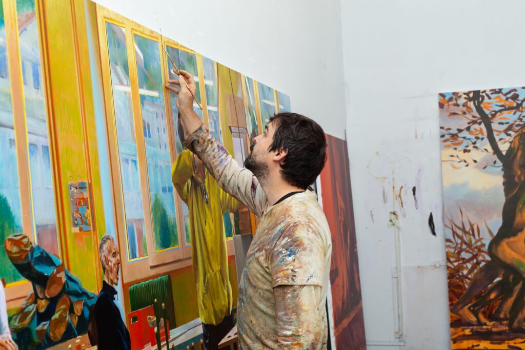 But then something shifts. After an hour, sometimes two hours of nothingness, I get restless. And it’s exactly in that boredom that the spark appears. Suddenly I feel drawn to start. What was empty becomes fascinating. Once I begin painting, I forget everything else, and I work long, long hours — often until nine or ten at night. So my rhythm is strange: resistance in the morning, obsession at night. I often compare it to sport — like a football player warming up. At first it feels pointless, but then the body takes over, and you don’t want to stop.