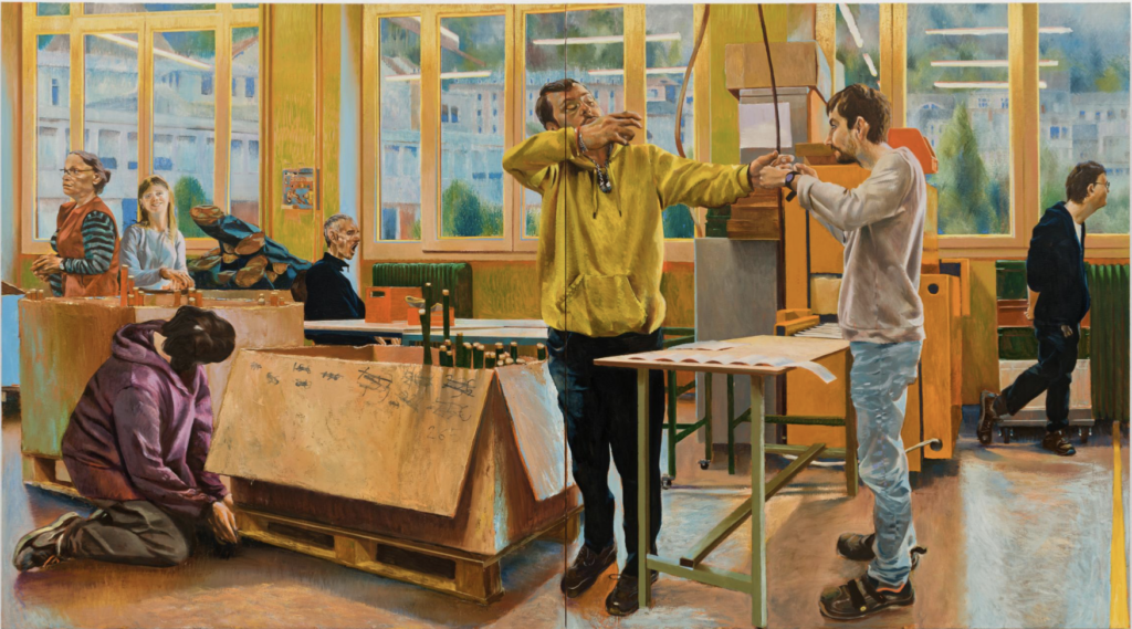 With that in mind, early on, you painted industrial spaces and deserted workstations—ghostly places of labour. What made you shift from these sites of absence to more theatrical and corporeal tableaux?