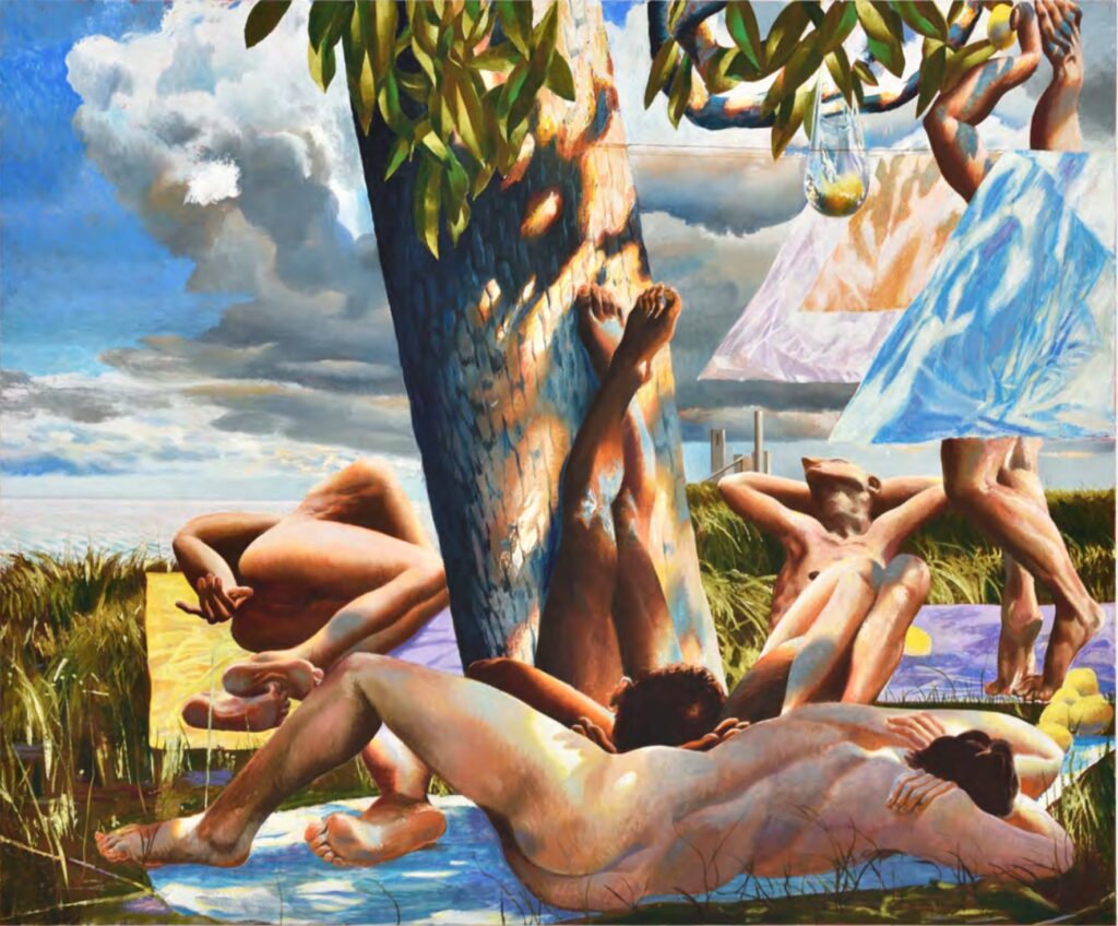 Laurent Proux: In Sunburn, the light functions as a Director on the stage, and the figures the garnish, the food of the sun. For The Nature Poem, I wanted to have a softer light, like the blue tone in To the night (2025) or the fallen light in the tryptic painting (The Nature Poem, 2025). I wanted to give to the elements depicted in the painting a more physical presence. Most of the time, the sun is not only a device, but also a character.