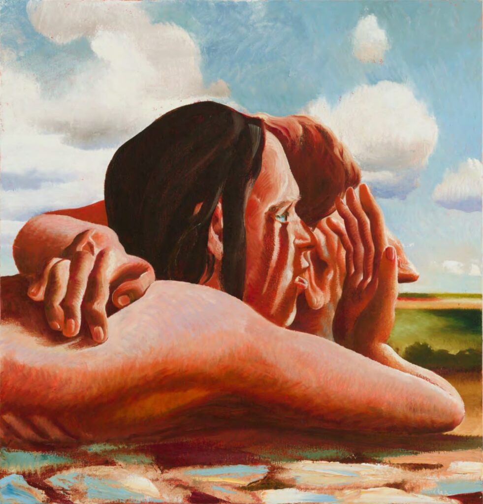 Across his canvases, the body is never fixed — it’s fractured, hybrid, or entangled, sometimes merging with vegetation, sometimes with machines, sometimes with itself. There’s a charge between tenderness and unease, intimacy and alienation, that pushes his work beyond figuration or abstraction and into a liminal, dreamlike space.