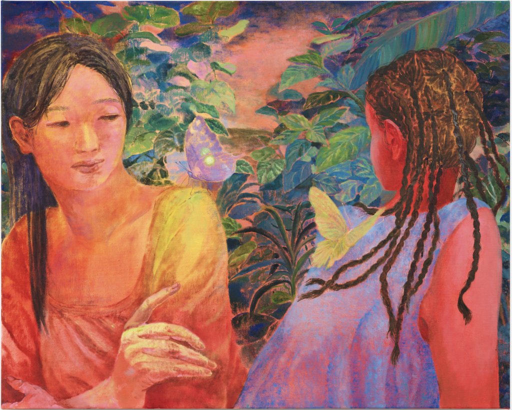 Minami: My solo show Half Waking at Tanya Leighton in Berlin is inspired by my personal memories, religious paintings. I have looked to Noh theater in which imaginary figures such as angels and spirits enter the natural world. Chaos and distraction surrounds modern life and society, so believing in the invisible and old folklore can help me to understand myself more deeply.