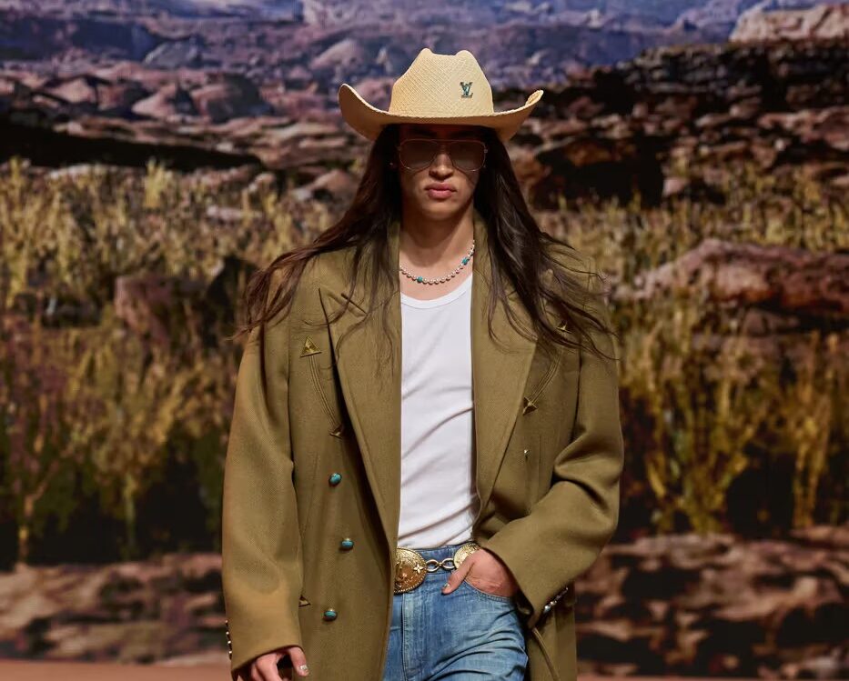 This collection breathes new life into the closets of the American West and contemporary country, infusing it with modernity. It forges diverse partnerships, notably with brands such as Timberland and various talents from Dakota and Lakota. These artists make their mark not only on accessories but also on the runway’s soundtrack and scenography, culminating in a homage to the evocative iconography and aesthetics of the American West.