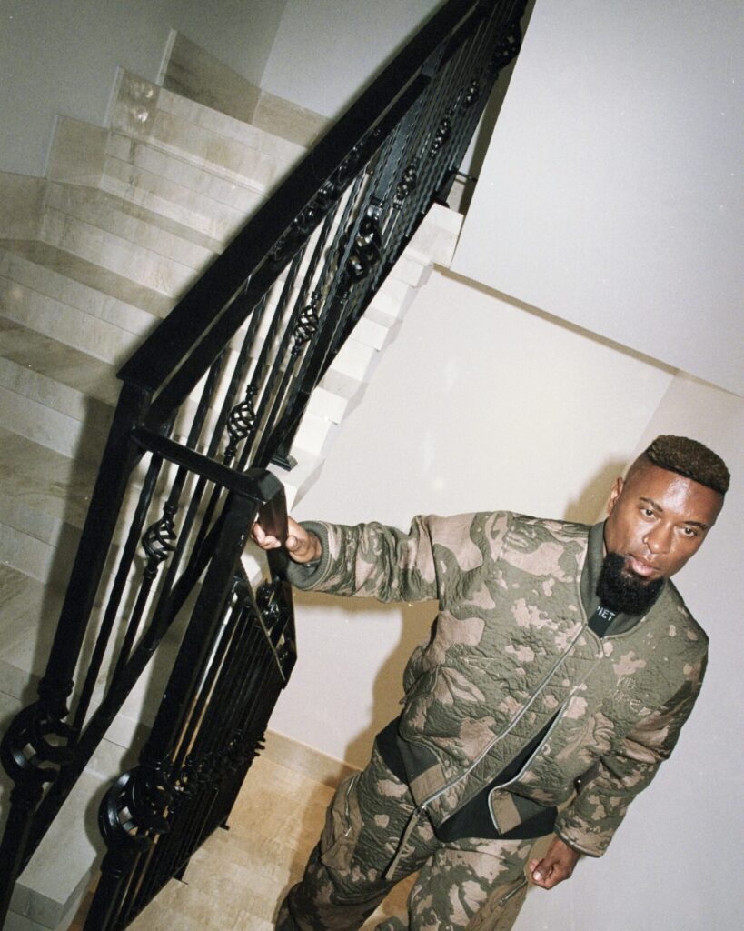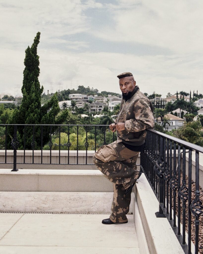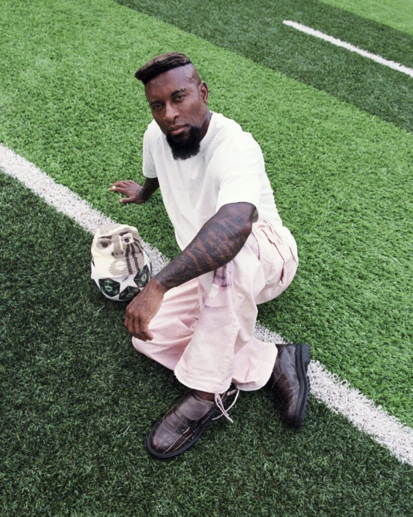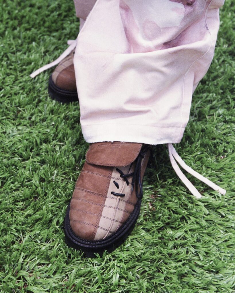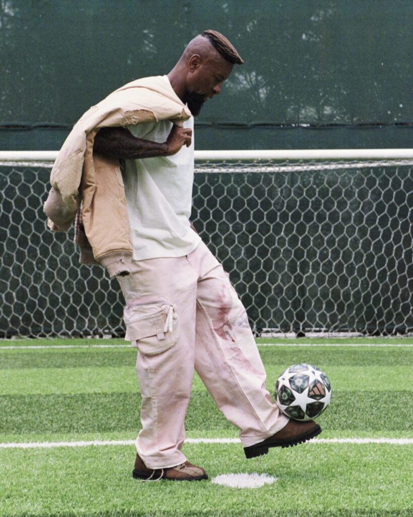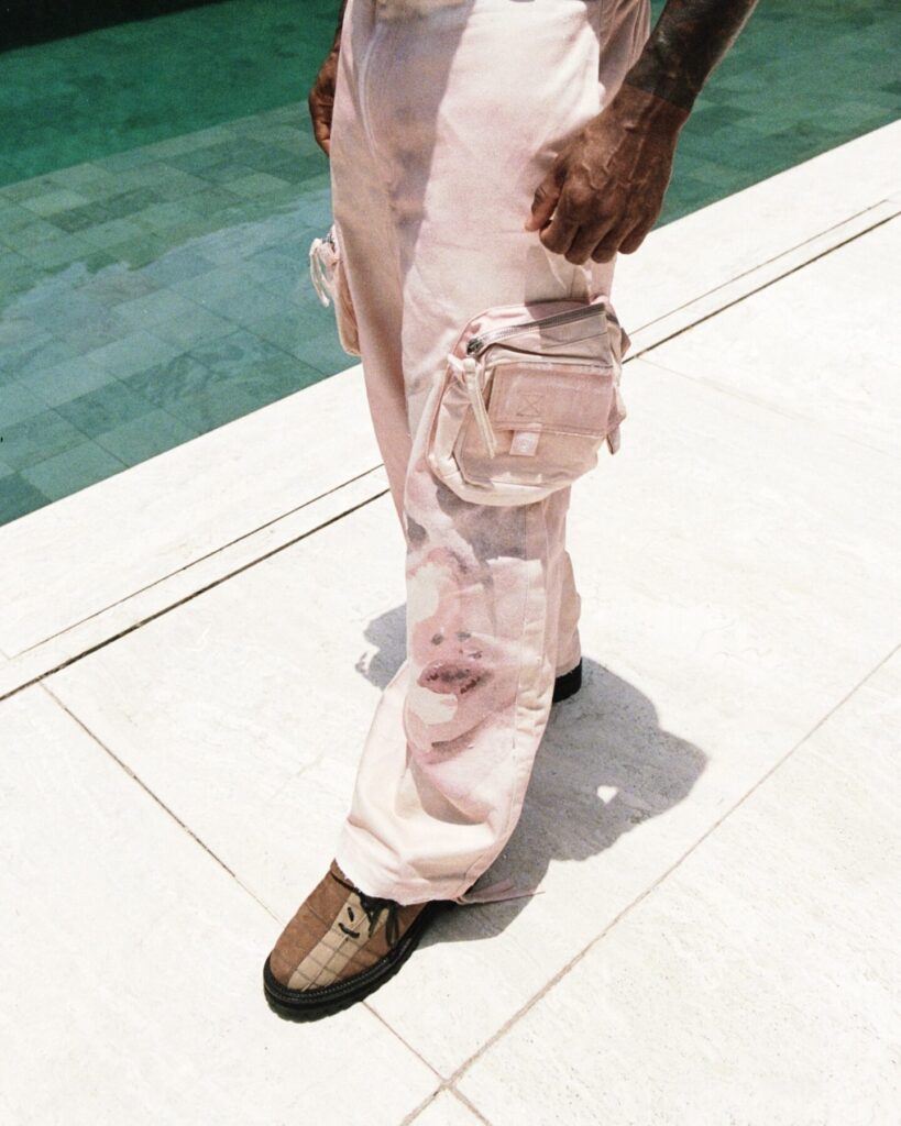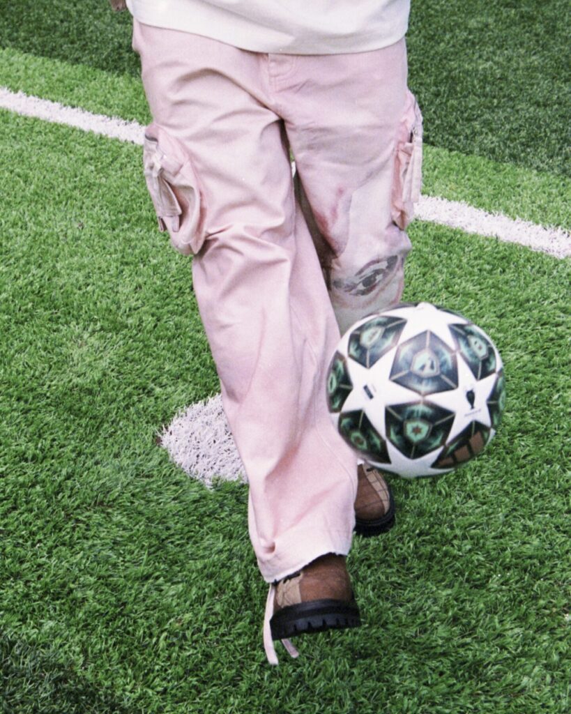 The result feels like a conversation between two creative languages that don’t try to overpower one another. From KidSuper comes the instinctive, narrative-driven imagery Dillane has become known for: hand-painted illustrations, expressive faces, camouflage motifs, and references pulled from football culture and pop iconography. These elements inject spontaneity and humour, grounding the collection in the emotional immediacy that defines KidSuper’s universe.