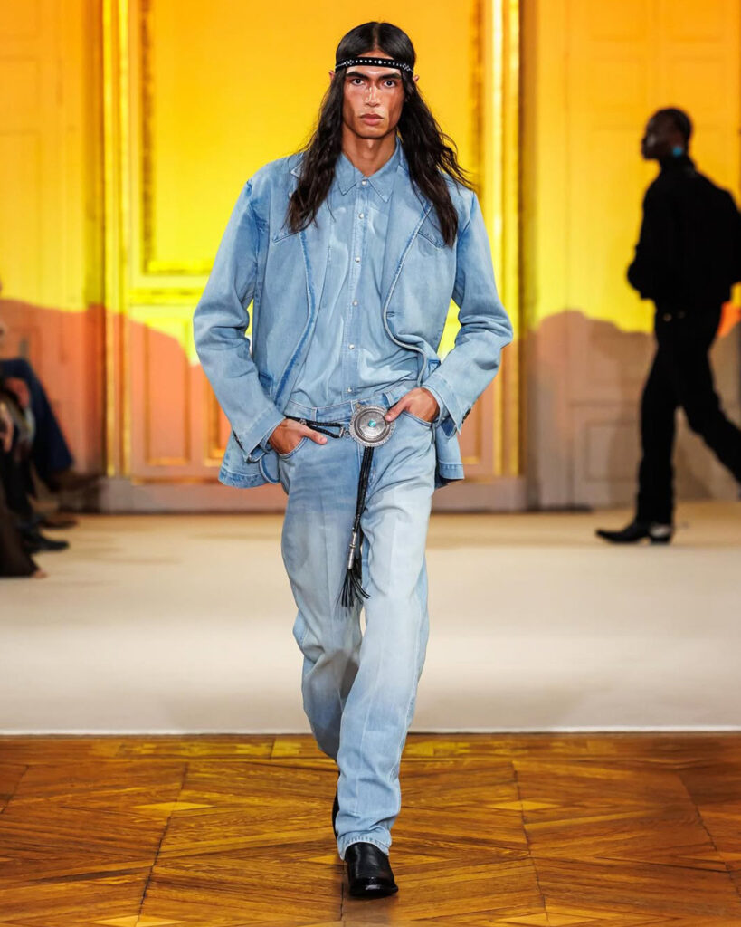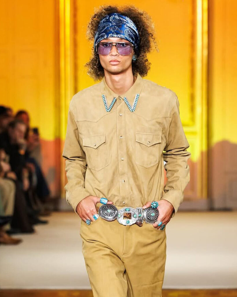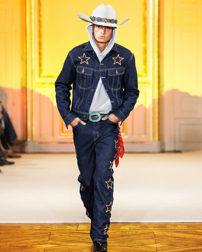 Classic codes of the American frontier were reworked for a contemporary stage—think denim-on-denim restructured with sharp tailoring, velvet jackets punctuated with gold star motifs, and fringe detailing used not as ornament but as a symbol of movement and liberation. Each look was grounded by a pair of Lucchese boots, bridging heritage craftsmanship with high-fashion flair.
