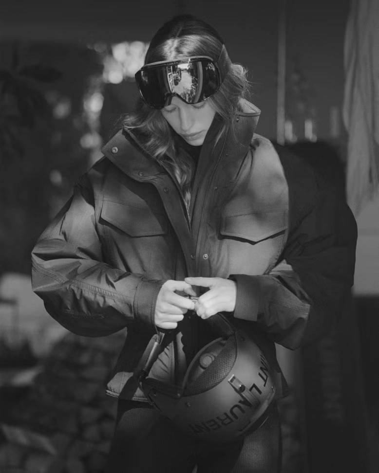 Luxury fashion has a long-standing love affair with winter sports, and this season the mountains are getting crowded. After Jacquemus made its first move into après-ski, Saint Laurent steps in with a Rive Droite capsule that extends Anthony Vaccarello’s razor-sharp universe into full alpine mode.