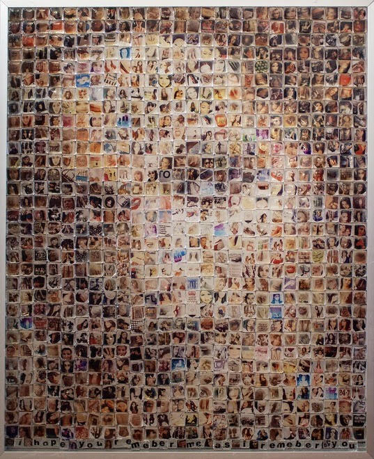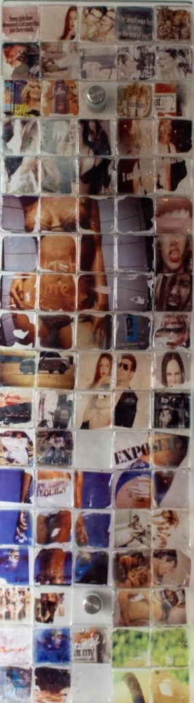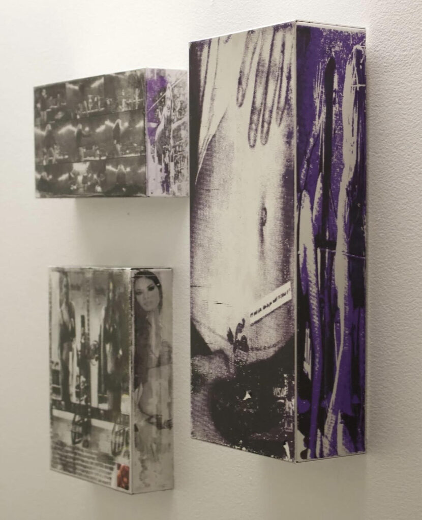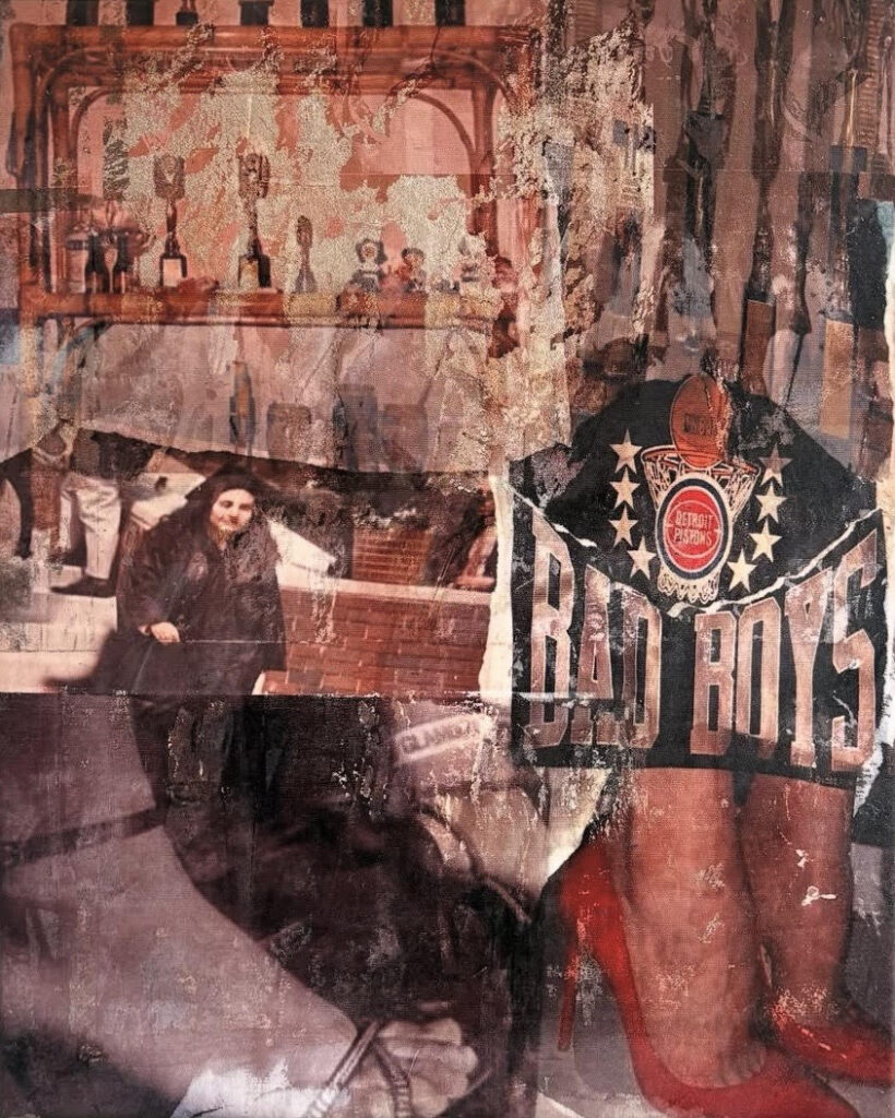 Working across materials including textiles, glass, leather, clothing, and found imagery, she preserves, distorts, and reimagines fragments of lived experience, allowing memory to slip, repeat, and reassemble itself. Her practice mirrors the way we actually remember: messy, emotional, nonlinear. Symbols recur like residues, lips, faces, text, silhouettes, worn down and recharged through repetition, pop culture, and personal history.