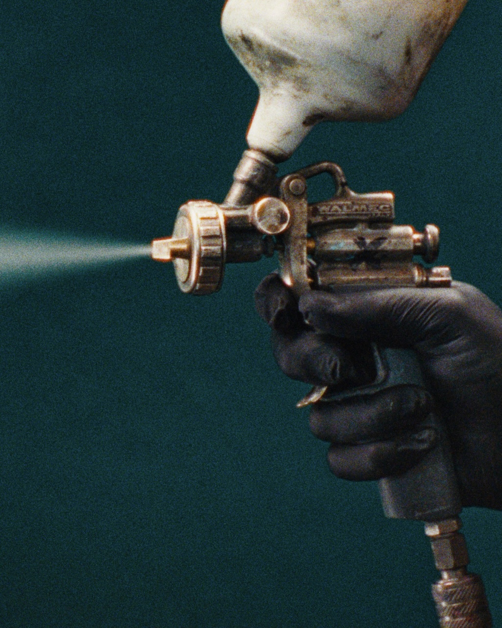 Each garment is individually dyed with specialized pigments, then subjected to a corrosion phase achieved through hand-painting and spray techniques. As the color dries, the chemical reaction begins to erode the surface layer, revealing complex tonal variations and a textured, weathered patina. Finally, the piece is washed to neutralize the process, fixing the fabric’s unique final appearance — ensuring that no two jackets are ever identical.