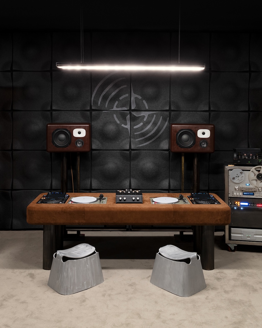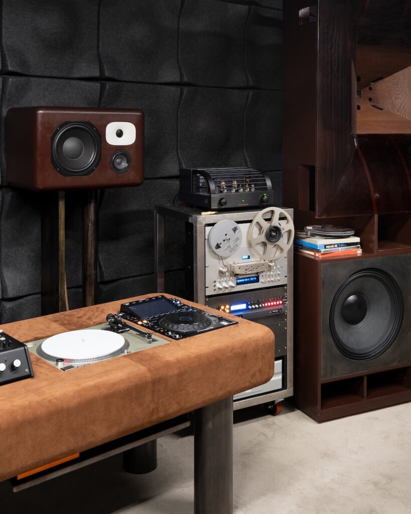 The project is a collaborative effort with Friendly Pressure, a London-based studio specializing in sound systems, which aligns with Stone Island’s LAB & LIFE philosophy—a commitment to pushing boundaries through material research and lived experience. At the heart of Studio One lies a bespoke high-fidelity modular audio system, engineered specifically for this occasion. This system features speakers designed by Bosco Taylor, paired with custom furniture created in collaboration with Fables Collective and ANDA_BA. Every detail, including the finishes, has been carefully curated to optimize the acoustics, ensuring that the sound quality is as much a part of the design as the physical elements surrounding it.