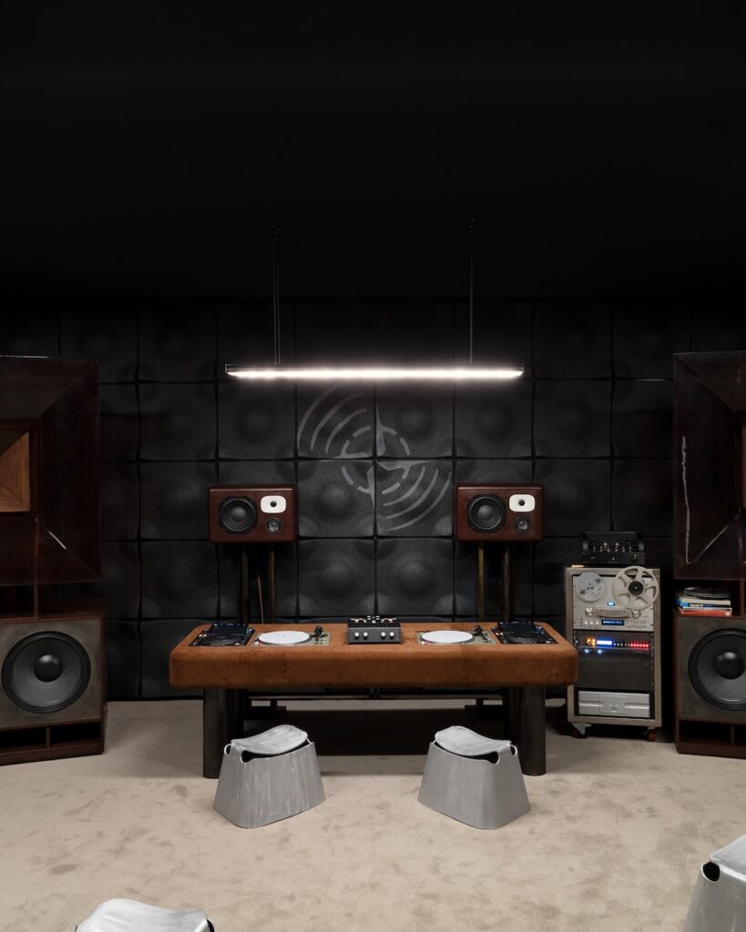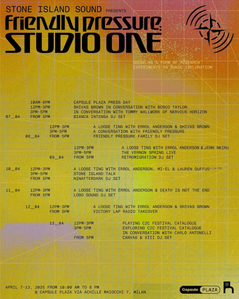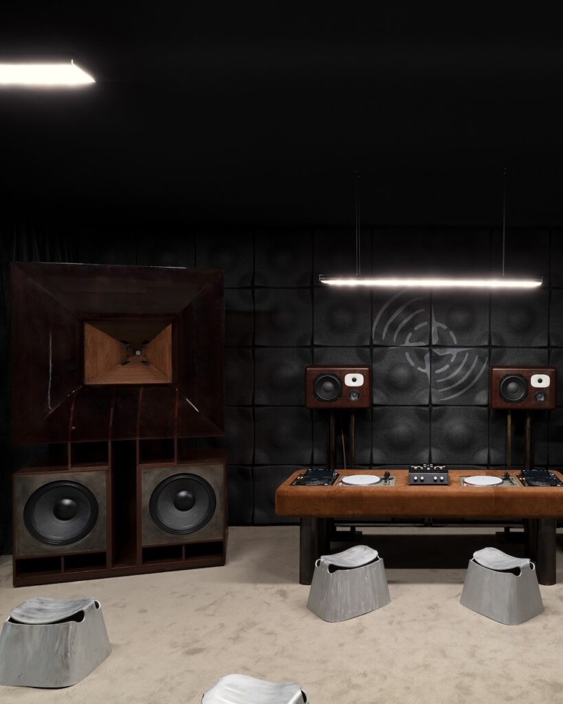 However, Studio One transcends its technical marvels to become a dynamic meeting point. During the day, the space will host a series of talks featuring producers, sound system designers, and musicians, fostering discussions that bridge the technical and creative aspects of sound and design. By night, the installation transforms into a performance venue, showcasing live sets from artists such as Retromigration, NINAFTERDARK, and Lobo Sound. These events highlight the installation’s dual role as both a showcase of cutting-edge technology and a platform for cultural exchange, reinforcing Stone Island’s reputation as a brand that seamlessly integrates innovation with community and creativity.