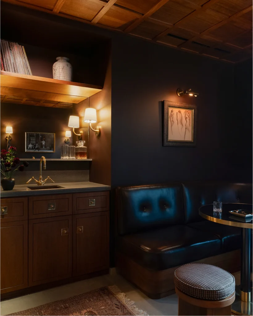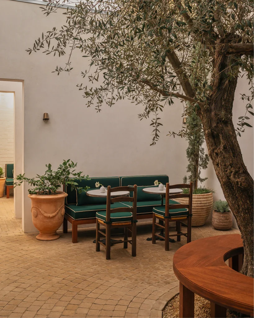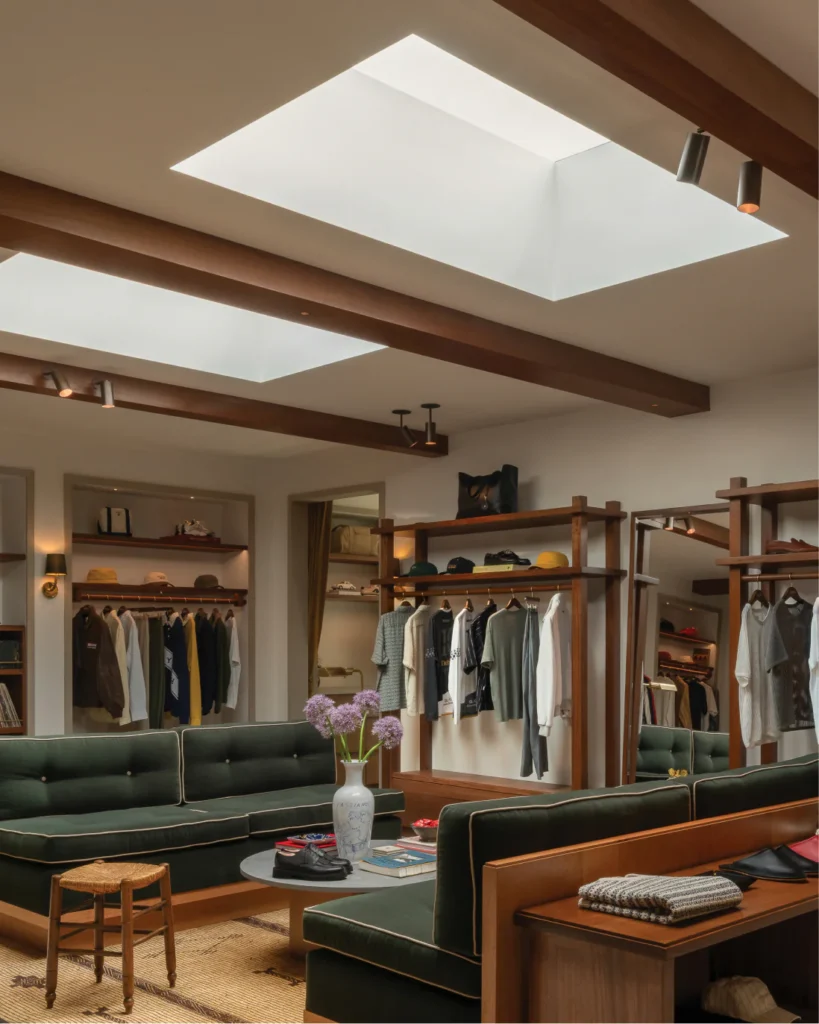 That sense of ease is reinforced by the details. The courtyard is centered around an 80-year-old olive tree sourced from California’s Central Valley, while the adjoining café includes the now-familiar Café Leon Dore / La Marzocco Linea 2 espresso machine and decorative elements including brass motifs by the late Greek artist Alekos Fassianos. Inside, the retail space mixes warm wood and limestone, with skylights, vintage furnishings and a Tyrrell Winston sculpture folding art and hospitality into the shopping environment.