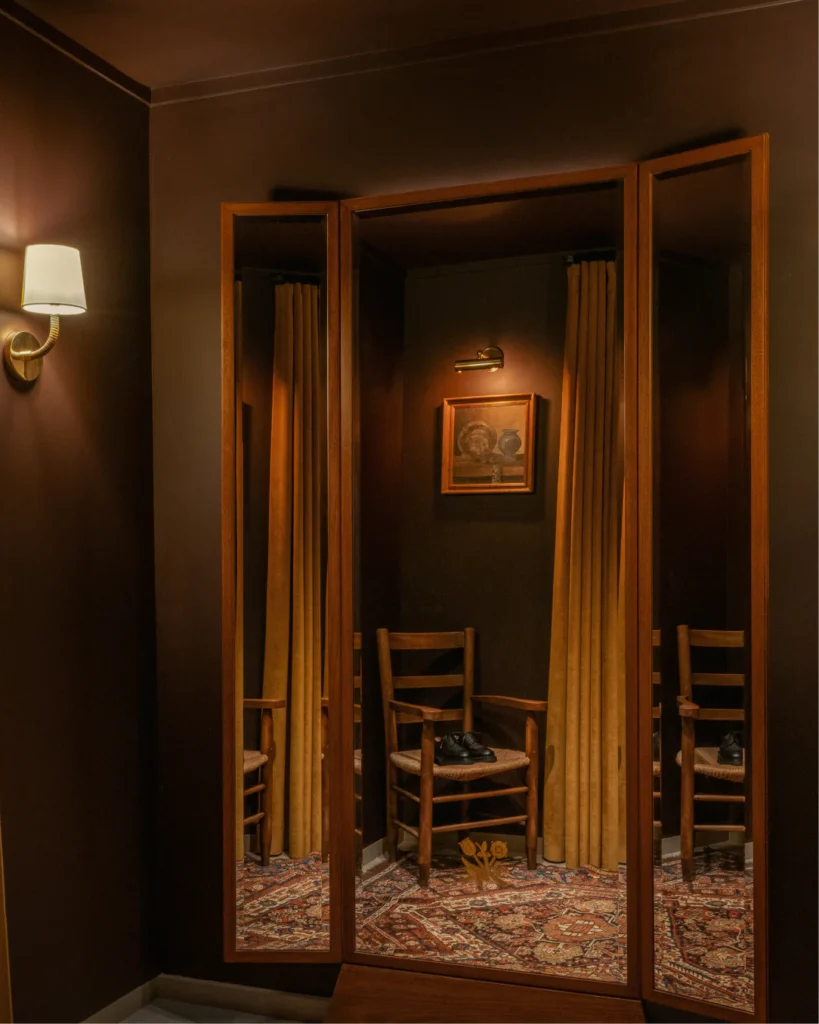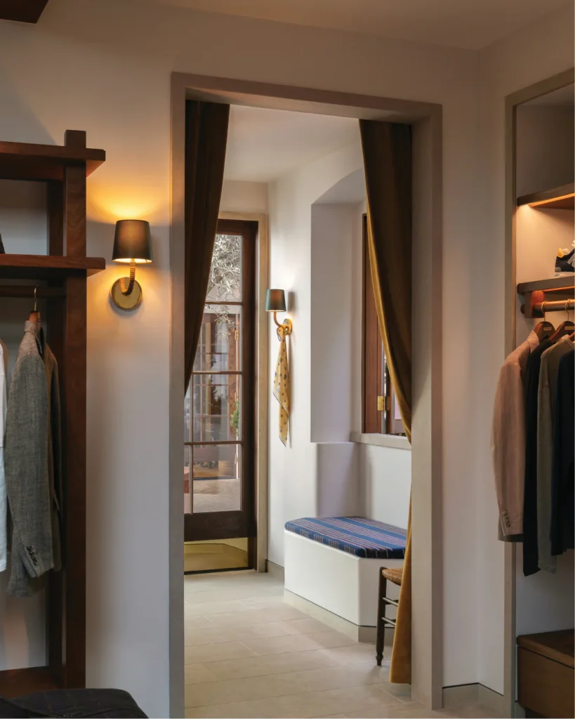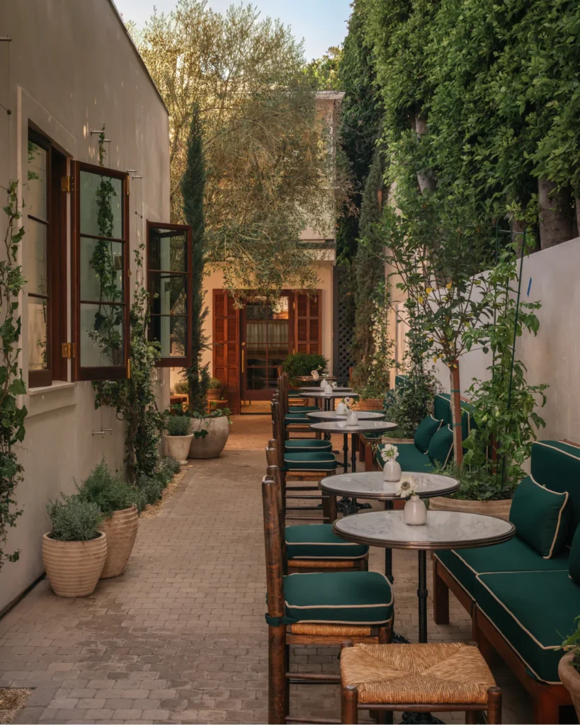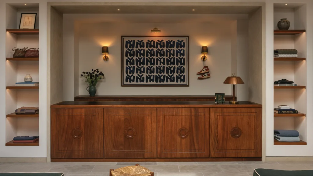 The store was developed with Sarita Posada Interiors, and according to the brand’s launch coverage, its architecture draws on the feeling of old European homes rather than the harder, shinier language of conventional luxury retail. There are soft stucco walls, custom wood windows, a cobblestone courtyard and a palette of warm, earth-toned materials that push the experience closer to domestic elegance than commercial display. The effect, at least on paper, is one of ease rather than theatre.
