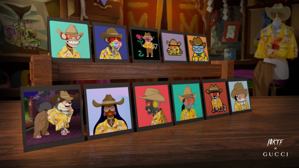 Gucci’s experimental concept store Gucci Vault and NFT accessories store 10KTF, has teamed up and created a collection of digital outfits, designed by the Italian luxury brands creative director Alessandro Michele, and created by 10KTF founder Wagmi-san. The collection consists of PFPs (Picture For Proof), from eleven selected NFT collections, including Bored Ape Yacht Club, Cool Cats, World of Women and many more.