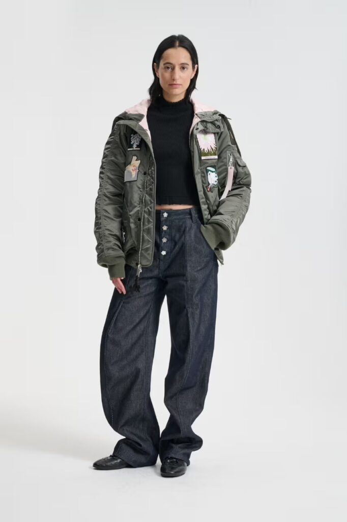 Rather than dismantling the bomber’s DNA, Bahnsen works from within it. The jackets retain their technical backbone, but their surfaces soften and expand. Floral motifs, cut, embossed, and embroidered, appear across the fabric like interruptions — delicate but deliberate. The shapes feel sculptural, almost architectural, transforming familiar military forms into garments that move and breathe with the body.