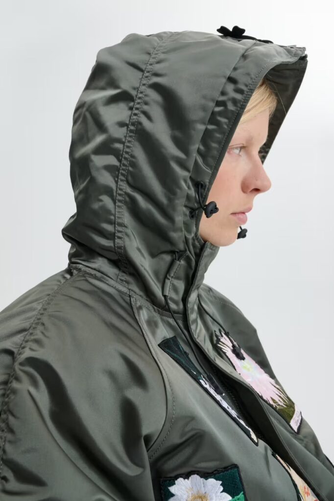 Colour choices stay restrained, leaning into black, navy, and military green, with subtle contrasts that reveal themselves slowly rather than demanding attention. In some pieces, a removable hood opens to reveal a quilted interior decorated with floral detailing, turning the act of wearing into a moment of discovery.