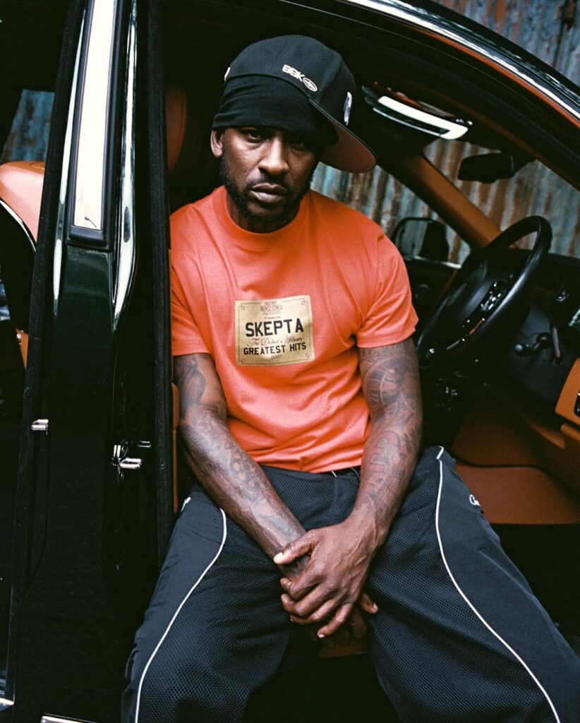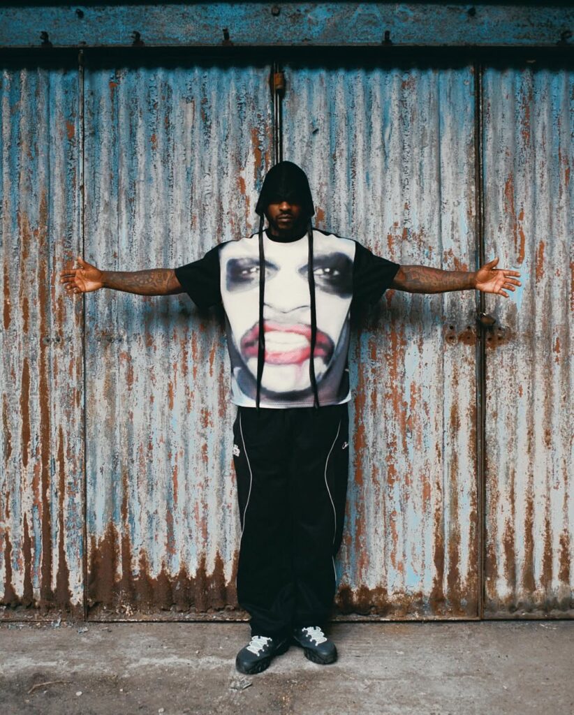 A standout piece includes a mesh tee featuring an illustration of Skepta in clown makeup — a subtle but powerful nod to the “Too Many Man” era, capturing the intersection of music, myth, and modern fashion iconography.